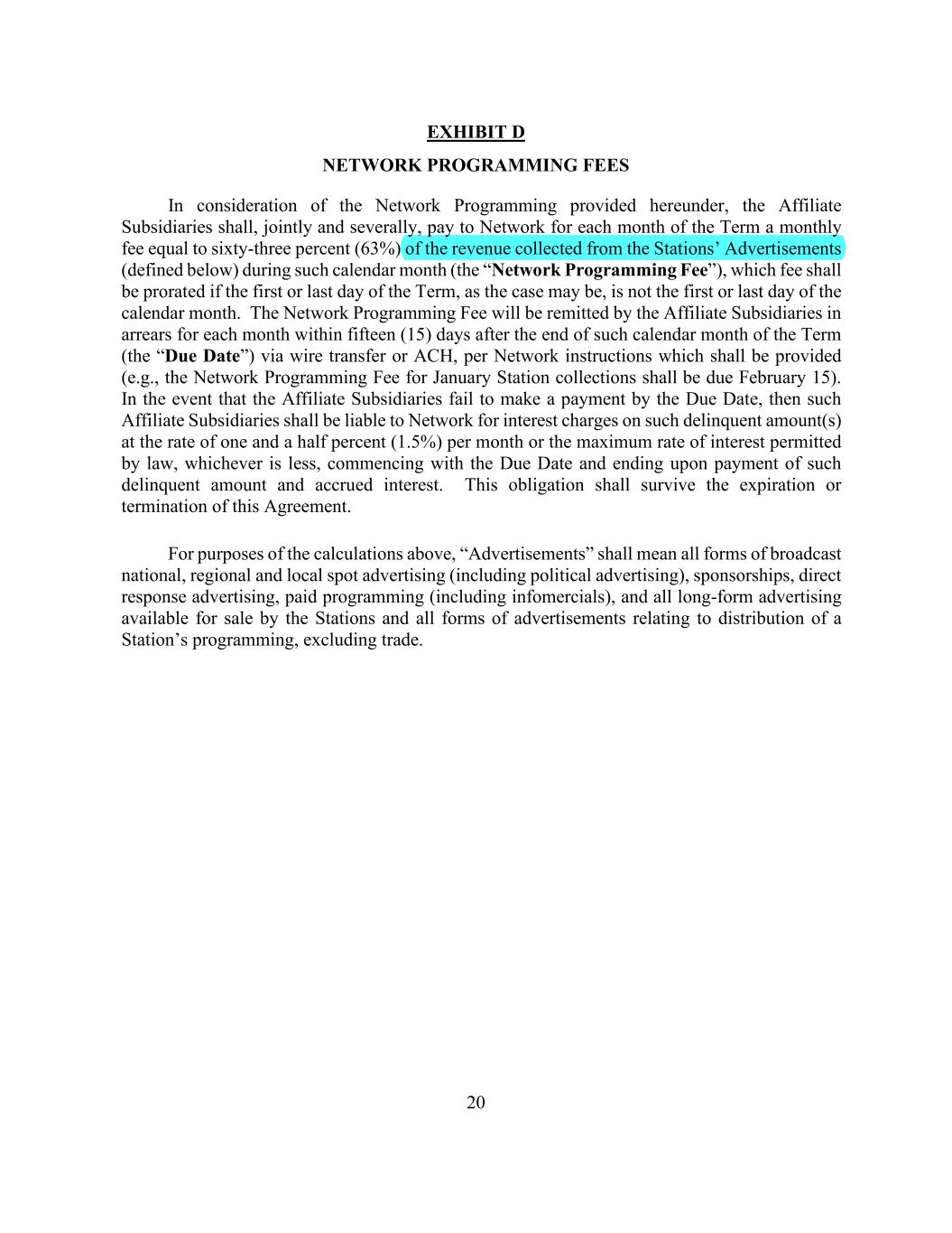 20 EXHIBIT D NETWORK PROGRAMMING FEES In consideration of the Network Programming provided hereunder, the Affiliate Subsidiaries shall, jointly and severally, pay to Network for each month of the Term a monthly fee equal to sixty-three percent (63%) of the revenue collected from the Stations’ Advertisements (defined below) during such calendar month (the “Network Programming Fee”), which fee shall be prorated if the first or last day of the Term, as the case may be, is not the first or last day of the calendar month. The Network Programming Fee will be remitted by the Affiliate Subsidiaries in arrears for each month within fifteen (15) days after the end of such calendar month of the Term (the “Due Date”) via wire transfer or ACH, per Network instructions which shall be provided (e.g., the Network Programming Fee for January Station collections shall be due February 15). In the event that the Affiliate Subsidiaries fail to make a payment by the Due Date, then such Affiliate Subsidiaries shall be liable to Network for interest charges on such delinquent amount(s) at the rate of one and a half percent (1.5%) per month or the maximum rate of interest permitted by law, whichever is less, commencing with the Due Date and ending upon payment of such delinquent amount and accrued interest. This obligation shall survive the expiration or termination of this Agreement. For purposes of the calculations above, “Advertisements” shall mean all forms of broadcast national, regional and local spot advertising (including political advertising), sponsorships, direct response advertising, paid programming (including infomercials), and all long-form advertising available for sale by the Stations and all forms of advertisements relating to distribution of a Station’s programming, excluding trade.