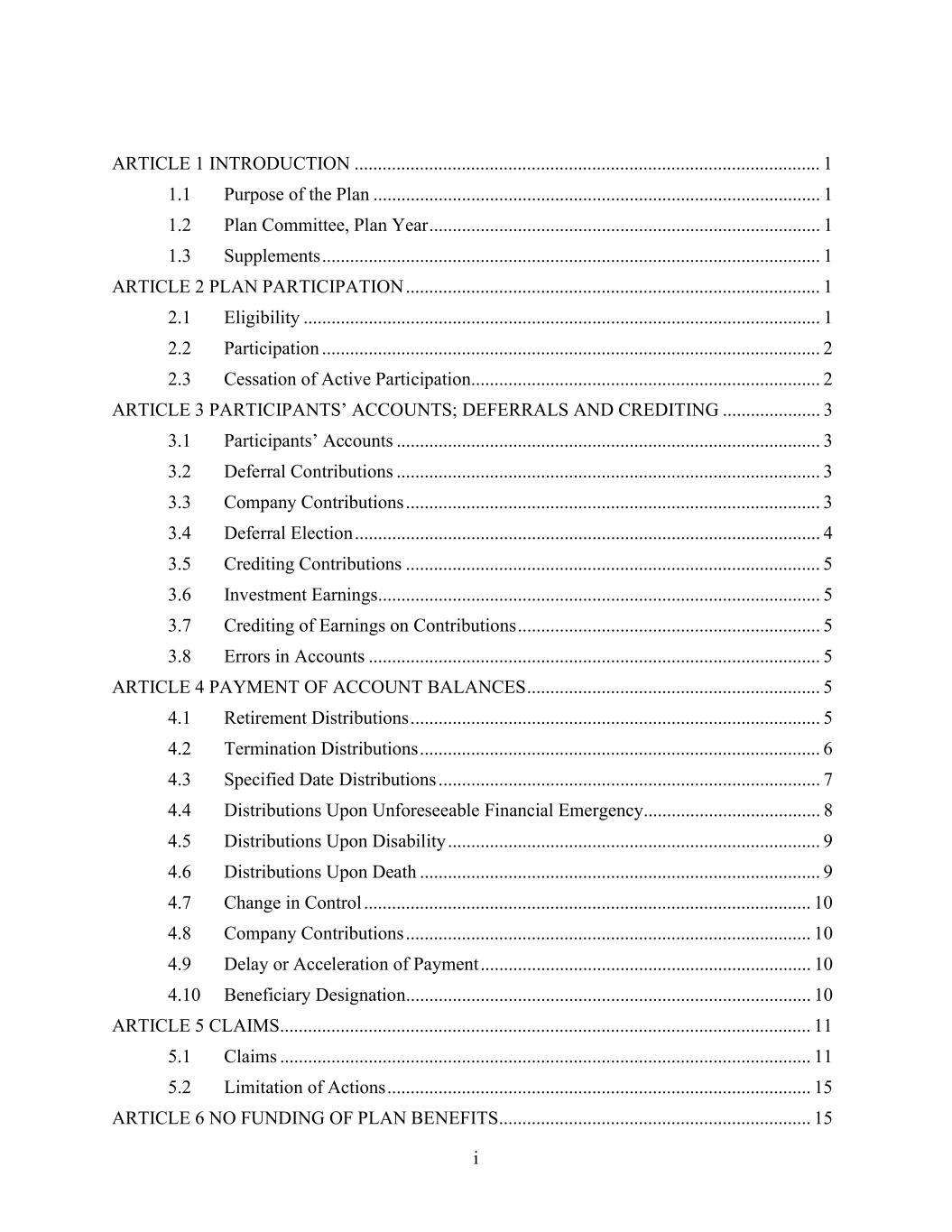i ARTICLE 1 INTRODUCTION .................................................................................................... 1 1.1 Purpose of the Plan ................................................................................................ 1 1.2 Plan Committee, Plan Year .................................................................................... 1 1.3 Supplements ........................................................................................................... 1 ARTICLE 2 PLAN PARTICIPATION ......................................................................................... 1 2.1 Eligibility ............................................................................................................... 1 2.2 Participation ........................................................................................................... 2 2.3 Cessation of Active Participation........................................................................... 2 ARTICLE 3 PARTICIPANTS’ ACCOUNTS; DEFERRALS AND CREDITING ..................... 3 3.1 Participants’ Accounts ........................................................................................... 3 3.2 Deferral Contributions ........................................................................................... 3 3.3 Company Contributions ......................................................................................... 3 3.4 Deferral Election .................................................................................................... 4 3.5 Crediting Contributions ......................................................................................... 5 3.6 Investment Earnings............................................................................................... 5 3.7 Crediting of Earnings on Contributions ................................................................. 5 3.8 Errors in Accounts ................................................................................................. 5 ARTICLE 4 PAYMENT OF ACCOUNT BALANCES ............................................................... 5 4.1 Retirement Distributions ........................................................................................ 5 4.2 Termination Distributions ...................................................................................... 6 4.3 Specified Date Distributions .................................................................................. 7 4.4 Distributions Upon Unforeseeable Financial Emergency...................................... 8 4.5 Distributions Upon Disability ................................................................................ 9 4.6 Distributions Upon Death ...................................................................................... 9 4.7 Change in Control ................................................................................................ 10 4.8 Company Contributions ....................................................................................... 10 4.9 Delay or Acceleration of Payment ....................................................................... 10 4.10 Beneficiary Designation....................................................................................... 10 ARTICLE 5 CLAIMS.................................................................................................................. 11 5.1 Claims .................................................................................................................. 11 5.2 Limitation of Actions ........................................................................................... 15 ARTICLE 6 NO FUNDING OF PLAN BENEFITS ................................................................... 15
