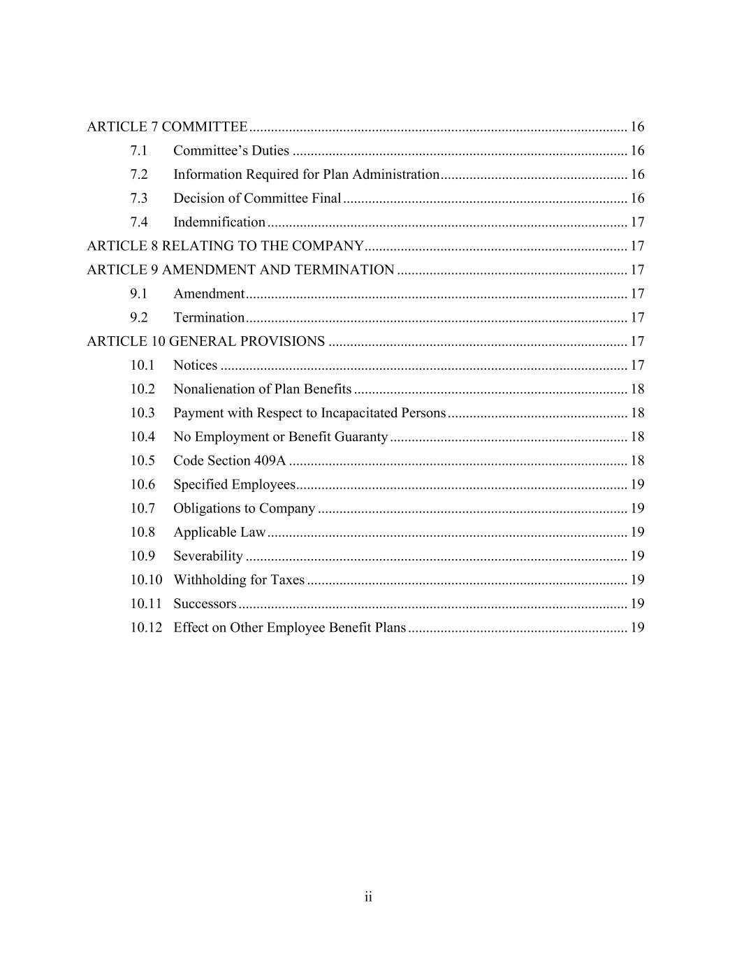 ii ARTICLE 7 COMMITTEE ......................................................................................................... 16 7.1 Committee’s Duties ............................................................................................. 16 7.2 Information Required for Plan Administration .................................................... 16 7.3 Decision of Committee Final ............................................................................... 16 7.4 Indemnification .................................................................................................... 17 ARTICLE 8 RELATING TO THE COMPANY......................................................................... 17 ARTICLE 9 AMENDMENT AND TERMINATION ................................................................ 17 9.1 Amendment .......................................................................................................... 17 9.2 Termination .......................................................................................................... 17 ARTICLE 10 GENERAL PROVISIONS ................................................................................... 17 10.1 Notices ................................................................................................................. 17 10.2 Nonalienation of Plan Benefits ............................................................................ 18 10.3 Payment with Respect to Incapacitated Persons .................................................. 18 10.4 No Employment or Benefit Guaranty .................................................................. 18 10.5 Code Section 409A .............................................................................................. 18 10.6 Specified Employees ............................................................................................ 19 10.7 Obligations to Company ...................................................................................... 19 10.8 Applicable Law .................................................................................................... 19 10.9 Severability .......................................................................................................... 19 10.10 Withholding for Taxes ......................................................................................... 19 10.11 Successors ............................................................................................................ 19 10.12 Effect on Other Employee Benefit Plans ............................................................. 19