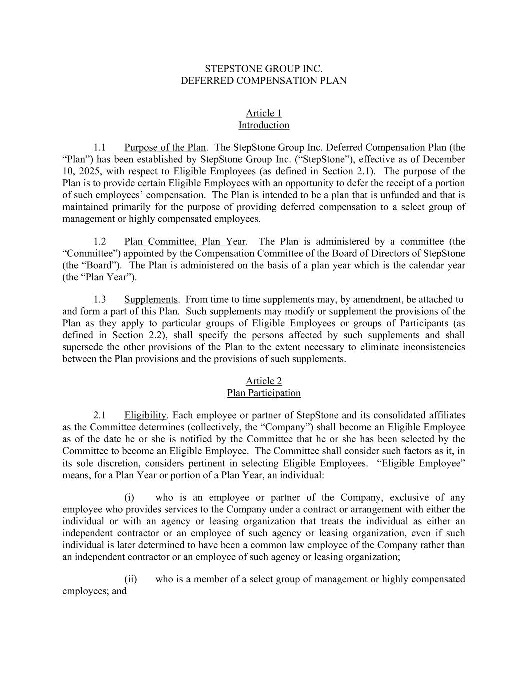 STEPSTONE GROUP INC. DEFERRED COMPENSATION PLAN Article 1 Introduction 1.1 Purpose of the Plan. The StepStone Group Inc. Deferred Compensation Plan (the “Plan”) has been established by StepStone Group Inc. (“StepStone”), effective as of December 10, 2025, with respect to Eligible Employees (as defined in Section 2.1). The purpose of the Plan is to provide certain Eligible Employees with an opportunity to defer the receipt of a portion of such employees’ compensation. The Plan is intended to be a plan that is unfunded and that is maintained primarily for the purpose of providing deferred compensation to a select group of management or highly compensated employees. 1.2 Plan Committee, Plan Year. The Plan is administered by a committee (the “Committee”) appointed by the Compensation Committee of the Board of Directors of StepStone (the “Board”). The Plan is administered on the basis of a plan year which is the calendar year (the “Plan Year”). 1.3 Supplements. From time to time supplements may, by amendment, be attached to and form a part of this Plan. Such supplements may modify or supplement the provisions of the Plan as they apply to particular groups of Eligible Employees or groups of Participants (as defined in Section 2.2), shall specify the persons affected by such supplements and shall supersede the other provisions of the Plan to the extent necessary to eliminate inconsistencies between the Plan provisions and the provisions of such supplements. Article 2 Plan Participation 2.1 Eligibility. Each employee or partner of StepStone and its consolidated affiliates as the Committee determines (collectively, the “Company”) shall become an Eligible Employee as of the date he or she is notified by the Committee that he or she has been selected by the Committee to become an Eligible Employee. The Committee shall consider such factors as it, in its sole discretion, considers pertinent in selecting Eligible Employees. “Eligible Employee” means, for a Plan Year or portion of a Plan Year, an individual: (i) who is an employee or partner of the Company, exclusive of any employee who provides services to the Company under a contract or arrangement with either the individual or with an agency or leasing organization that treats the individual as either an independent contractor or an employee of such agency or leasing organization, even if such individual is later determined to have been a common law employee of the Company rather than an independent contractor or an employee of such agency or leasing organization; (ii) who is a member of a select group of management or highly compensated employees; and