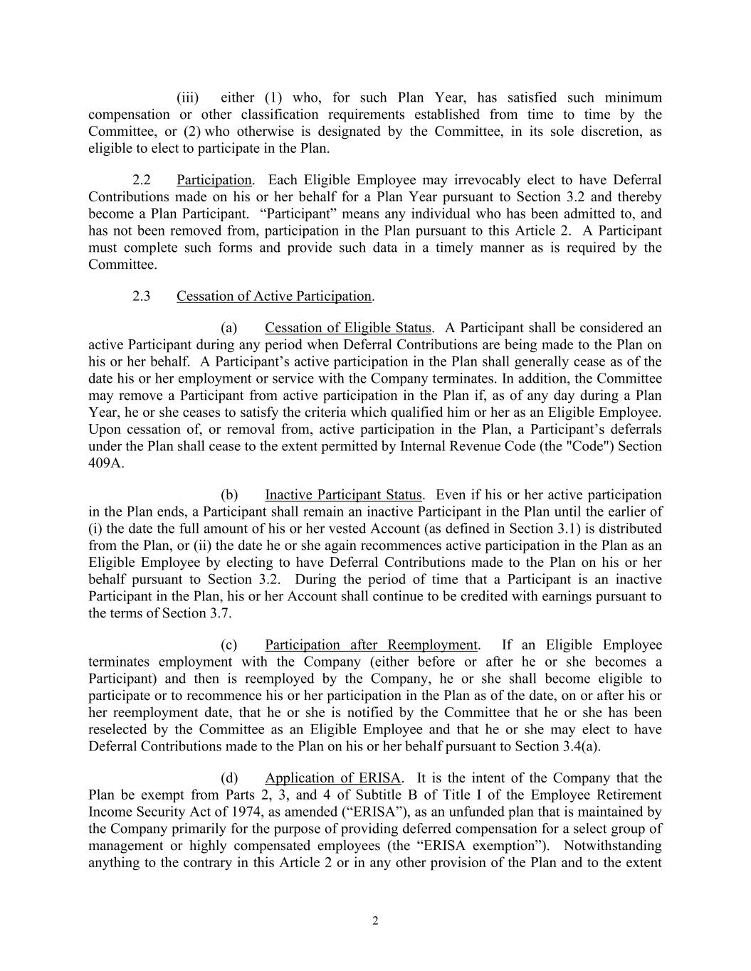 2 (iii) either (1) who, for such Plan Year, has satisfied such minimum compensation or other classification requirements established from time to time by the Committee, or (2) who otherwise is designated by the Committee, in its sole discretion, as eligible to elect to participate in the Plan. 2.2 Participation. Each Eligible Employee may irrevocably elect to have Deferral Contributions made on his or her behalf for a Plan Year pursuant to Section 3.2 and thereby become a Plan Participant. “Participant” means any individual who has been admitted to, and has not been removed from, participation in the Plan pursuant to this Article 2. A Participant must complete such forms and provide such data in a timely manner as is required by the Committee. 2.3 Cessation of Active Participation. (a) Cessation of Eligible Status. A Participant shall be considered an active Participant during any period when Deferral Contributions are being made to the Plan on his or her behalf. A Participant’s active participation in the Plan shall generally cease as of the date his or her employment or service with the Company terminates. In addition, the Committee may remove a Participant from active participation in the Plan if, as of any day during a Plan Year, he or she ceases to satisfy the criteria which qualified him or her as an Eligible Employee. Upon cessation of, or removal from, active participation in the Plan, a Participant’s deferrals under the Plan shall cease to the extent permitted by Internal Revenue Code (the "Code") Section 409A. (b) Inactive Participant Status. Even if his or her active participation in the Plan ends, a Participant shall remain an inactive Participant in the Plan until the earlier of (i) the date the full amount of his or her vested Account (as defined in Section 3.1) is distributed from the Plan, or (ii) the date he or she again recommences active participation in the Plan as an Eligible Employee by electing to have Deferral Contributions made to the Plan on his or her behalf pursuant to Section 3.2. During the period of time that a Participant is an inactive Participant in the Plan, his or her Account shall continue to be credited with earnings pursuant to the terms of Section 3.7. (c) Participation after Reemployment. If an Eligible Employee terminates employment with the Company (either before or after he or she becomes a Participant) and then is reemployed by the Company, he or she shall become eligible to participate or to recommence his or her participation in the Plan as of the date, on or after his or her reemployment date, that he or she is notified by the Committee that he or she has been reselected by the Committee as an Eligible Employee and that he or she may elect to have Deferral Contributions made to the Plan on his or her behalf pursuant to Section 3.4(a). (d) Application of ERISA. It is the intent of the Company that the Plan be exempt from Parts 2, 3, and 4 of Subtitle B of Title I of the Employee Retirement Income Security Act of 1974, as amended (“ERISA”), as an unfunded plan that is maintained by the Company primarily for the purpose of providing deferred compensation for a select group of management or highly compensated employees (the “ERISA exemption”). Notwithstanding anything to the contrary in this Article 2 or in any other provision of the Plan and to the extent