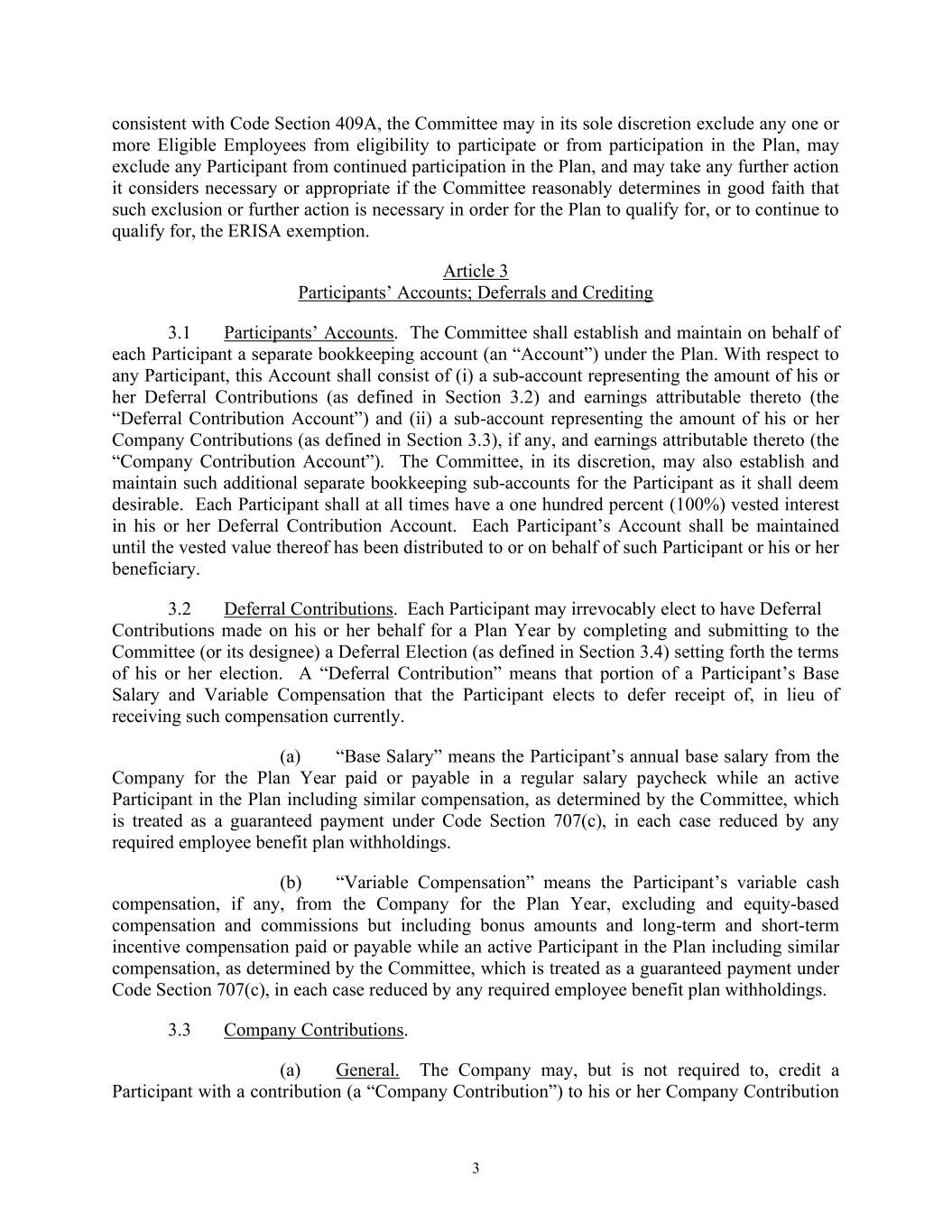 3 consistent with Code Section 409A, the Committee may in its sole discretion exclude any one or more Eligible Employees from eligibility to participate or from participation in the Plan, may exclude any Participant from continued participation in the Plan, and may take any further action it considers necessary or appropriate if the Committee reasonably determines in good faith that such exclusion or further action is necessary in order for the Plan to qualify for, or to continue to qualify for, the ERISA exemption. Article 3 Participants’ Accounts; Deferrals and Crediting 3.1 Participants’ Accounts. The Committee shall establish and maintain on behalf of each Participant a separate bookkeeping account (an “Account”) under the Plan. With respect to any Participant, this Account shall consist of (i) a sub-account representing the amount of his or her Deferral Contributions (as defined in Section 3.2) and earnings attributable thereto (the “Deferral Contribution Account”) and (ii) a sub-account representing the amount of his or her Company Contributions (as defined in Section 3.3), if any, and earnings attributable thereto (the “Company Contribution Account”). The Committee, in its discretion, may also establish and maintain such additional separate bookkeeping sub-accounts for the Participant as it shall deem desirable. Each Participant shall at all times have a one hundred percent (100%) vested interest in his or her Deferral Contribution Account. Each Participant’s Account shall be maintained until the vested value thereof has been distributed to or on behalf of such Participant or his or her beneficiary. 3.2 Deferral Contributions. Each Participant may irrevocably elect to have Deferral Contributions made on his or her behalf for a Plan Year by completing and submitting to the Committee (or its designee) a Deferral Election (as defined in Section 3.4) setting forth the terms of his or her election. A “Deferral Contribution” means that portion of a Participant’s Base Salary and Variable Compensation that the Participant elects to defer receipt of, in lieu of receiving such compensation currently. (a) “Base Salary” means the Participant’s annual base salary from the Company for the Plan Year paid or payable in a regular salary paycheck while an active Participant in the Plan including similar compensation, as determined by the Committee, which is treated as a guaranteed payment under Code Section 707(c), in each case reduced by any required employee benefit plan withholdings. (b) “Variable Compensation” means the Participant’s variable cash compensation, if any, from the Company for the Plan Year, excluding and equity-based compensation and commissions but including bonus amounts and long-term and short-term incentive compensation paid or payable while an active Participant in the Plan including similar compensation, as determined by the Committee, which is treated as a guaranteed payment under Code Section 707(c), in each case reduced by any required employee benefit plan withholdings. 3.3 Company Contributions. (a) General. The Company may, but is not required to, credit a Participant with a contribution (a “Company Contribution”) to his or her Company Contribution