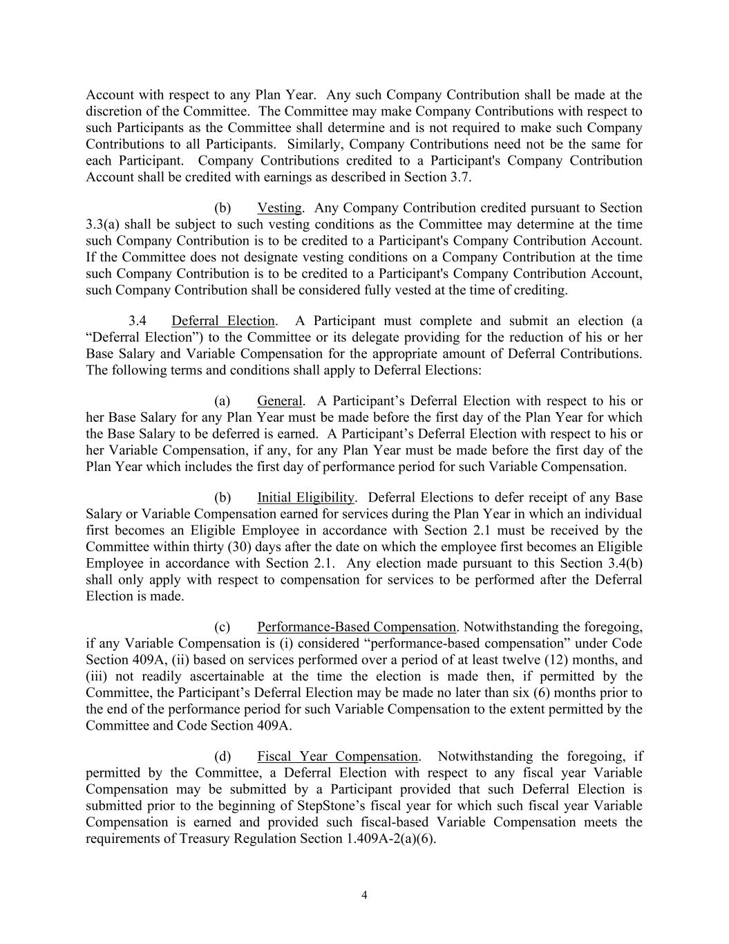 4 Account with respect to any Plan Year. Any such Company Contribution shall be made at the discretion of the Committee. The Committee may make Company Contributions with respect to such Participants as the Committee shall determine and is not required to make such Company Contributions to all Participants. Similarly, Company Contributions need not be the same for each Participant. Company Contributions credited to a Participant's Company Contribution Account shall be credited with earnings as described in Section 3.7. (b) Vesting. Any Company Contribution credited pursuant to Section 3.3(a) shall be subject to such vesting conditions as the Committee may determine at the time such Company Contribution is to be credited to a Participant's Company Contribution Account. If the Committee does not designate vesting conditions on a Company Contribution at the time such Company Contribution is to be credited to a Participant's Company Contribution Account, such Company Contribution shall be considered fully vested at the time of crediting. 3.4 Deferral Election. A Participant must complete and submit an election (a “Deferral Election”) to the Committee or its delegate providing for the reduction of his or her Base Salary and Variable Compensation for the appropriate amount of Deferral Contributions. The following terms and conditions shall apply to Deferral Elections: (a) General. A Participant’s Deferral Election with respect to his or her Base Salary for any Plan Year must be made before the first day of the Plan Year for which the Base Salary to be deferred is earned. A Participant’s Deferral Election with respect to his or her Variable Compensation, if any, for any Plan Year must be made before the first day of the Plan Year which includes the first day of performance period for such Variable Compensation. (b) Initial Eligibility. Deferral Elections to defer receipt of any Base Salary or Variable Compensation earned for services during the Plan Year in which an individual first becomes an Eligible Employee in accordance with Section 2.1 must be received by the Committee within thirty (30) days after the date on which the employee first becomes an Eligible Employee in accordance with Section 2.1. Any election made pursuant to this Section 3.4(b) shall only apply with respect to compensation for services to be performed after the Deferral Election is made. (c) Performance-Based Compensation. Notwithstanding the foregoing, if any Variable Compensation is (i) considered “performance-based compensation” under Code Section 409A, (ii) based on services performed over a period of at least twelve (12) months, and (iii) not readily ascertainable at the time the election is made then, if permitted by the Committee, the Participant’s Deferral Election may be made no later than six (6) months prior to the end of the performance period for such Variable Compensation to the extent permitted by the Committee and Code Section 409A. (d) Fiscal Year Compensation. Notwithstanding the foregoing, if permitted by the Committee, a Deferral Election with respect to any fiscal year Variable Compensation may be submitted by a Participant provided that such Deferral Election is submitted prior to the beginning of StepStone’s fiscal year for which such fiscal year Variable Compensation is earned and provided such fiscal-based Variable Compensation meets the requirements of Treasury Regulation Section 1.409A-2(a)(6).