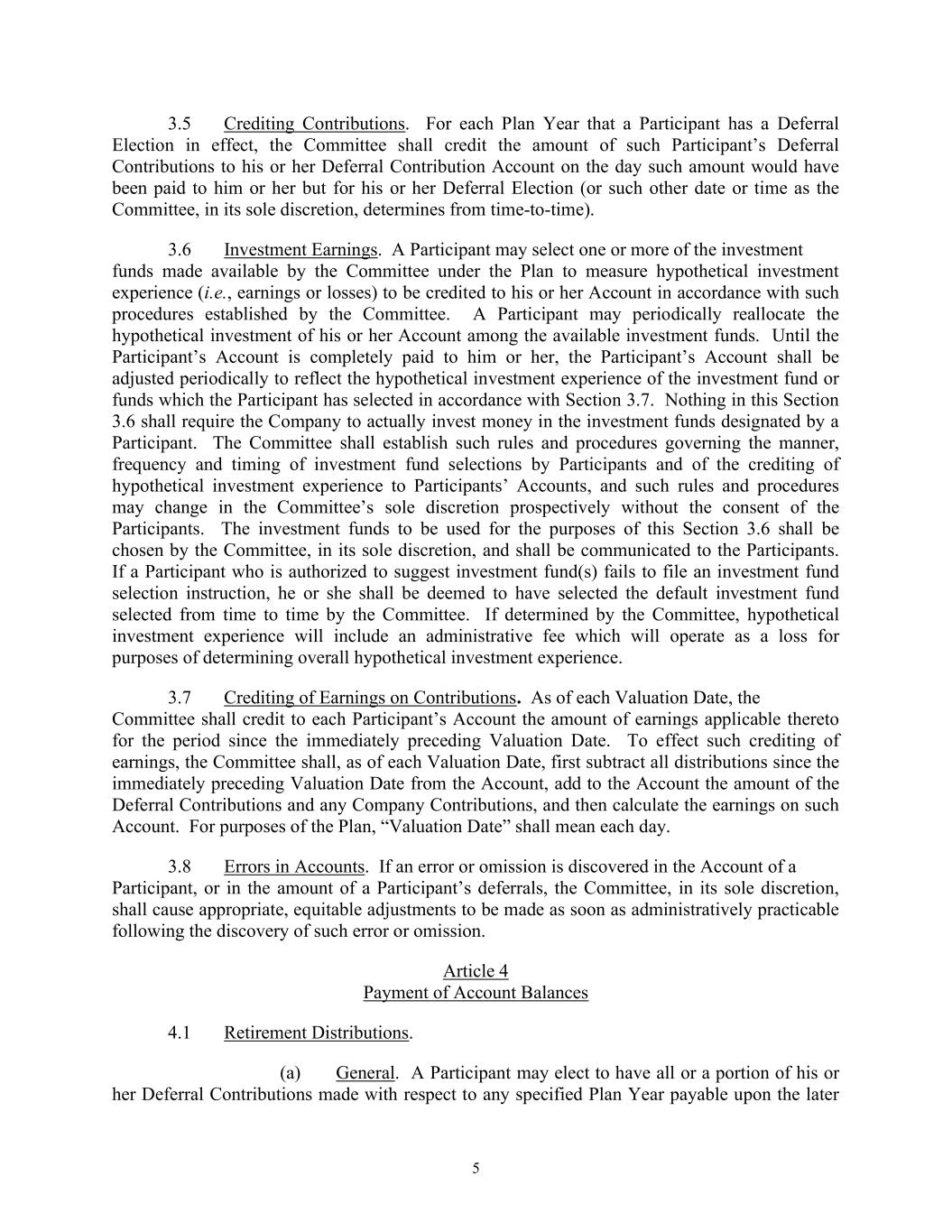 5 3.5 Crediting Contributions. For each Plan Year that a Participant has a Deferral Election in effect, the Committee shall credit the amount of such Participant’s Deferral Contributions to his or her Deferral Contribution Account on the day such amount would have been paid to him or her but for his or her Deferral Election (or such other date or time as the Committee, in its sole discretion, determines from time-to-time). 3.6 Investment Earnings. A Participant may select one or more of the investment funds made available by the Committee under the Plan to measure hypothetical investment experience (i.e., earnings or losses) to be credited to his or her Account in accordance with such procedures established by the Committee. A Participant may periodically reallocate the hypothetical investment of his or her Account among the available investment funds. Until the Participant’s Account is completely paid to him or her, the Participant’s Account shall be adjusted periodically to reflect the hypothetical investment experience of the investment fund or funds which the Participant has selected in accordance with Section 3.7. Nothing in this Section 3.6 shall require the Company to actually invest money in the investment funds designated by a Participant. The Committee shall establish such rules and procedures governing the manner, frequency and timing of investment fund selections by Participants and of the crediting of hypothetical investment experience to Participants’ Accounts, and such rules and procedures may change in the Committee’s sole discretion prospectively without the consent of the Participants. The investment funds to be used for the purposes of this Section 3.6 shall be chosen by the Committee, in its sole discretion, and shall be communicated to the Participants. If a Participant who is authorized to suggest investment fund(s) fails to file an investment fund selection instruction, he or she shall be deemed to have selected the default investment fund selected from time to time by the Committee. If determined by the Committee, hypothetical investment experience will include an administrative fee which will operate as a loss for purposes of determining overall hypothetical investment experience. 3.7 Crediting of Earnings on Contributions. As of each Valuation Date, the Committee shall credit to each Participant’s Account the amount of earnings applicable thereto for the period since the immediately preceding Valuation Date. To effect such crediting of earnings, the Committee shall, as of each Valuation Date, first subtract all distributions since the immediately preceding Valuation Date from the Account, add to the Account the amount of the Deferral Contributions and any Company Contributions, and then calculate the earnings on such Account. For purposes of the Plan, “Valuation Date” shall mean each day. 3.8 Errors in Accounts. If an error or omission is discovered in the Account of a Participant, or in the amount of a Participant’s deferrals, the Committee, in its sole discretion, shall cause appropriate, equitable adjustments to be made as soon as administratively practicable following the discovery of such error or omission. Article 4 Payment of Account Balances 4.1 Retirement Distributions. (a) General. A Participant may elect to have all or a portion of his or her Deferral Contributions made with respect to any specified Plan Year payable upon the later