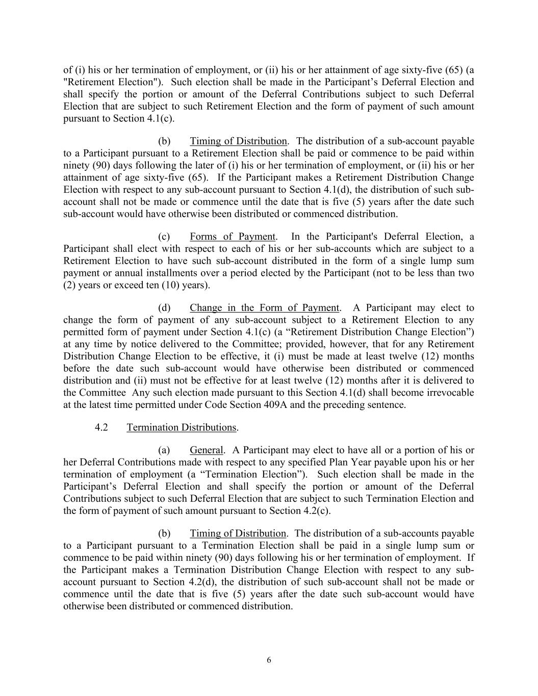 6 of (i) his or her termination of employment, or (ii) his or her attainment of age sixty-five (65) (a "Retirement Election"). Such election shall be made in the Participant’s Deferral Election and shall specify the portion or amount of the Deferral Contributions subject to such Deferral Election that are subject to such Retirement Election and the form of payment of such amount pursuant to Section 4.1(c). (b) Timing of Distribution. The distribution of a sub-account payable to a Participant pursuant to a Retirement Election shall be paid or commence to be paid within ninety (90) days following the later of (i) his or her termination of employment, or (ii) his or her attainment of age sixty-five (65). If the Participant makes a Retirement Distribution Change Election with respect to any sub-account pursuant to Section 4.1(d), the distribution of such sub- account shall not be made or commence until the date that is five (5) years after the date such sub-account would have otherwise been distributed or commenced distribution. (c) Forms of Payment. In the Participant's Deferral Election, a Participant shall elect with respect to each of his or her sub-accounts which are subject to a Retirement Election to have such sub-account distributed in the form of a single lump sum payment or annual installments over a period elected by the Participant (not to be less than two (2) years or exceed ten (10) years). (d) Change in the Form of Payment. A Participant may elect to change the form of payment of any sub-account subject to a Retirement Election to any permitted form of payment under Section 4.1(c) (a “Retirement Distribution Change Election”) at any time by notice delivered to the Committee; provided, however, that for any Retirement Distribution Change Election to be effective, it (i) must be made at least twelve (12) months before the date such sub-account would have otherwise been distributed or commenced distribution and (ii) must not be effective for at least twelve (12) months after it is delivered to the Committee Any such election made pursuant to this Section 4.1(d) shall become irrevocable at the latest time permitted under Code Section 409A and the preceding sentence. 4.2 Termination Distributions. (a) General. A Participant may elect to have all or a portion of his or her Deferral Contributions made with respect to any specified Plan Year payable upon his or her termination of employment (a “Termination Election”). Such election shall be made in the Participant’s Deferral Election and shall specify the portion or amount of the Deferral Contributions subject to such Deferral Election that are subject to such Termination Election and the form of payment of such amount pursuant to Section 4.2(c). (b) Timing of Distribution. The distribution of a sub-accounts payable to a Participant pursuant to a Termination Election shall be paid in a single lump sum or commence to be paid within ninety (90) days following his or her termination of employment. If the Participant makes a Termination Distribution Change Election with respect to any sub- account pursuant to Section 4.2(d), the distribution of such sub-account shall not be made or commence until the date that is five (5) years after the date such sub-account would have otherwise been distributed or commenced distribution.