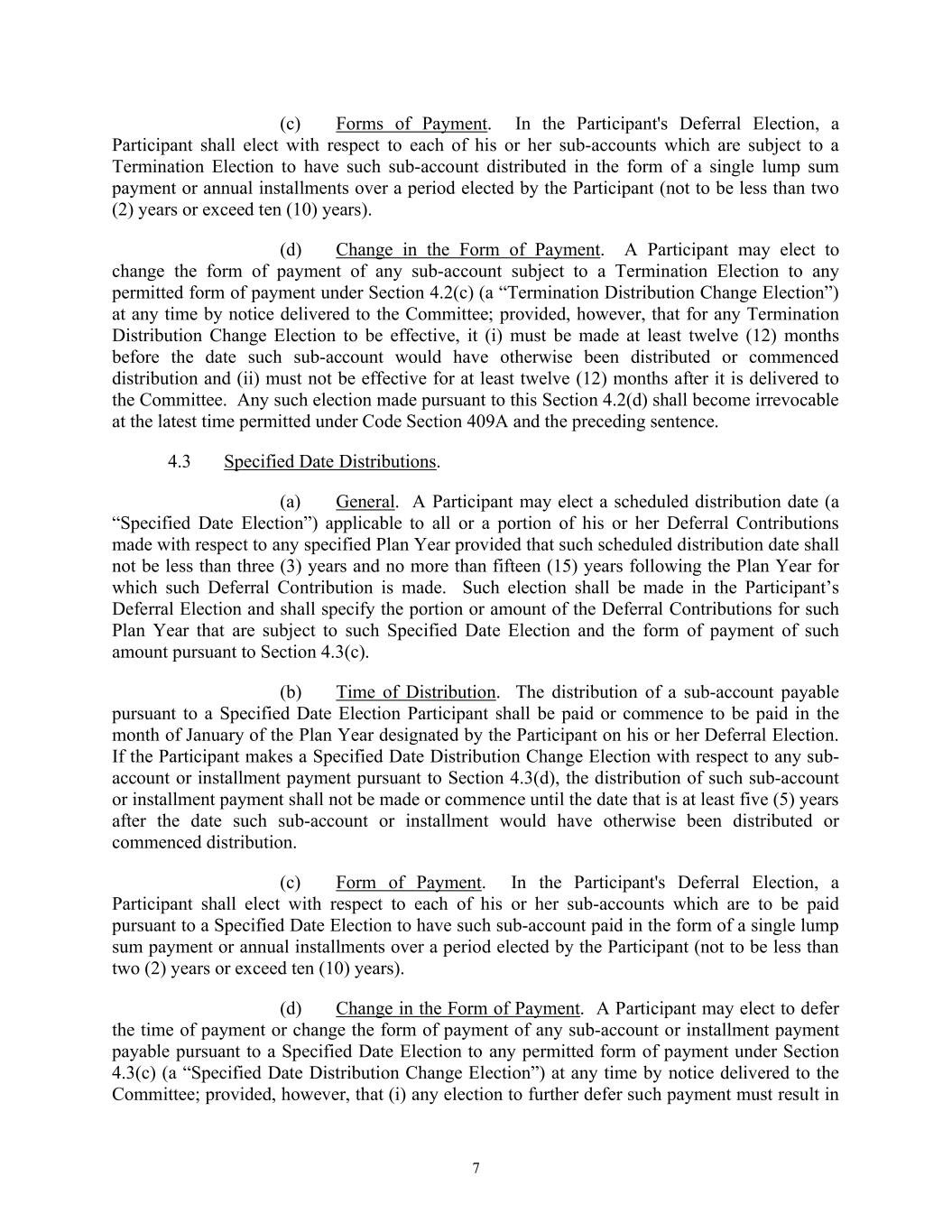 7 (c) Forms of Payment. In the Participant's Deferral Election, a Participant shall elect with respect to each of his or her sub-accounts which are subject to a Termination Election to have such sub-account distributed in the form of a single lump sum payment or annual installments over a period elected by the Participant (not to be less than two (2) years or exceed ten (10) years). (d) Change in the Form of Payment. A Participant may elect to change the form of payment of any sub-account subject to a Termination Election to any permitted form of payment under Section 4.2(c) (a “Termination Distribution Change Election”) at any time by notice delivered to the Committee; provided, however, that for any Termination Distribution Change Election to be effective, it (i) must be made at least twelve (12) months before the date such sub-account would have otherwise been distributed or commenced distribution and (ii) must not be effective for at least twelve (12) months after it is delivered to the Committee. Any such election made pursuant to this Section 4.2(d) shall become irrevocable at the latest time permitted under Code Section 409A and the preceding sentence. 4.3 Specified Date Distributions. (a) General. A Participant may elect a scheduled distribution date (a “Specified Date Election”) applicable to all or a portion of his or her Deferral Contributions made with respect to any specified Plan Year provided that such scheduled distribution date shall not be less than three (3) years and no more than fifteen (15) years following the Plan Year for which such Deferral Contribution is made. Such election shall be made in the Participant’s Deferral Election and shall specify the portion or amount of the Deferral Contributions for such Plan Year that are subject to such Specified Date Election and the form of payment of such amount pursuant to Section 4.3(c). (b) Time of Distribution. The distribution of a sub-account payable pursuant to a Specified Date Election Participant shall be paid or commence to be paid in the month of January of the Plan Year designated by the Participant on his or her Deferral Election. If the Participant makes a Specified Date Distribution Change Election with respect to any sub- account or installment payment pursuant to Section 4.3(d), the distribution of such sub-account or installment payment shall not be made or commence until the date that is at least five (5) years after the date such sub-account or installment would have otherwise been distributed or commenced distribution. (c) Form of Payment. In the Participant's Deferral Election, a Participant shall elect with respect to each of his or her sub-accounts which are to be paid pursuant to a Specified Date Election to have such sub-account paid in the form of a single lump sum payment or annual installments over a period elected by the Participant (not to be less than two (2) years or exceed ten (10) years). (d) Change in the Form of Payment. A Participant may elect to defer the time of payment or change the form of payment of any sub-account or installment payment payable pursuant to a Specified Date Election to any permitted form of payment under Section 4.3(c) (a “Specified Date Distribution Change Election”) at any time by notice delivered to the Committee; provided, however, that (i) any election to further defer such payment must result in