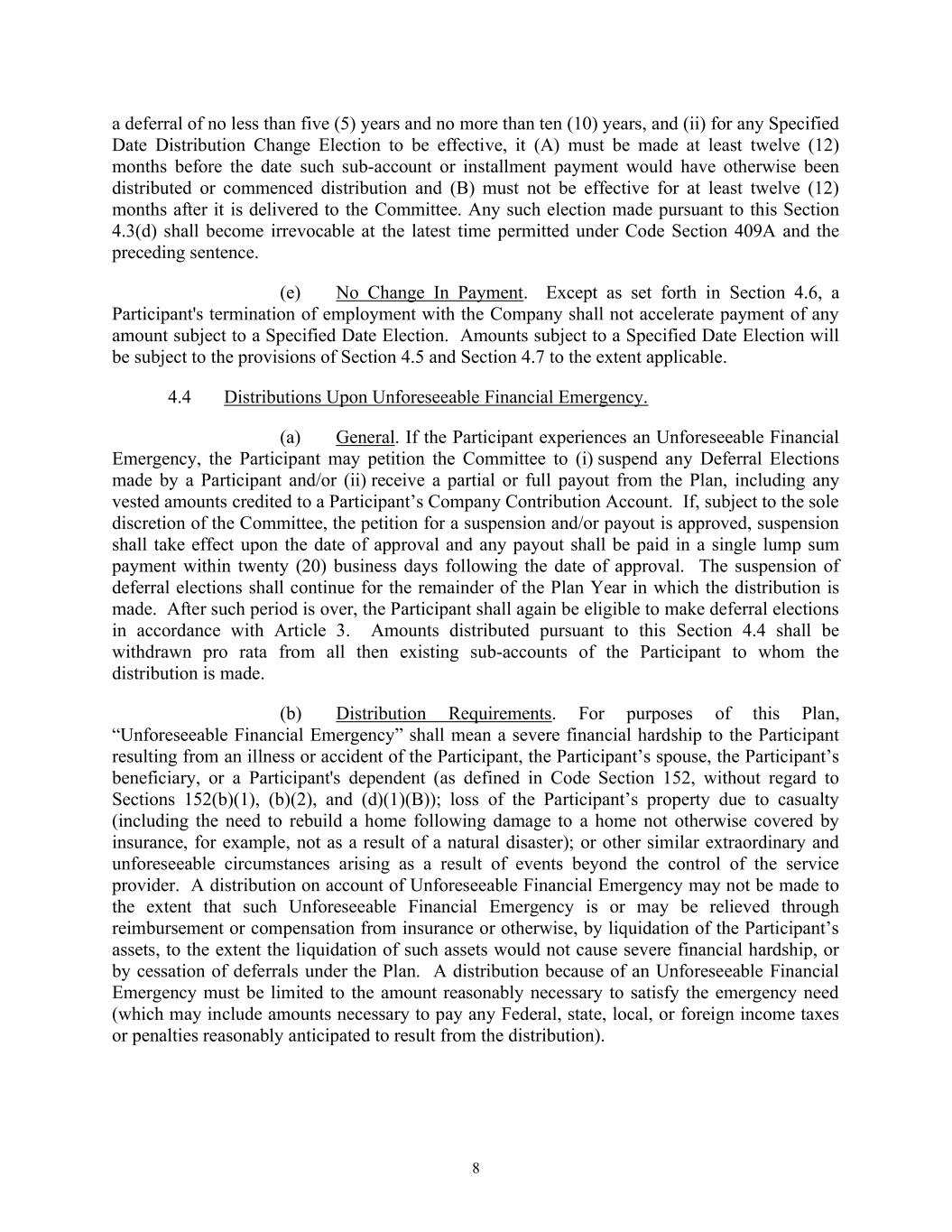 8 a deferral of no less than five (5) years and no more than ten (10) years, and (ii) for any Specified Date Distribution Change Election to be effective, it (A) must be made at least twelve (12) months before the date such sub-account or installment payment would have otherwise been distributed or commenced distribution and (B) must not be effective for at least twelve (12) months after it is delivered to the Committee. Any such election made pursuant to this Section 4.3(d) shall become irrevocable at the latest time permitted under Code Section 409A and the preceding sentence. (e) No Change In Payment. Except as set forth in Section 4.6, a Participant's termination of employment with the Company shall not accelerate payment of any amount subject to a Specified Date Election. Amounts subject to a Specified Date Election will be subject to the provisions of Section 4.5 and Section 4.7 to the extent applicable. 4.4 Distributions Upon Unforeseeable Financial Emergency. (a) General. If the Participant experiences an Unforeseeable Financial Emergency, the Participant may petition the Committee to (i) suspend any Deferral Elections made by a Participant and/or (ii) receive a partial or full payout from the Plan, including any vested amounts credited to a Participant’s Company Contribution Account. If, subject to the sole discretion of the Committee, the petition for a suspension and/or payout is approved, suspension shall take effect upon the date of approval and any payout shall be paid in a single lump sum payment within twenty (20) business days following the date of approval. The suspension of deferral elections shall continue for the remainder of the Plan Year in which the distribution is made. After such period is over, the Participant shall again be eligible to make deferral elections in accordance with Article 3. Amounts distributed pursuant to this Section 4.4 shall be withdrawn pro rata from all then existing sub-accounts of the Participant to whom the distribution is made. (b) Distribution Requirements. For purposes of this Plan, “Unforeseeable Financial Emergency” shall mean a severe financial hardship to the Participant resulting from an illness or accident of the Participant, the Participant’s spouse, the Participant’s beneficiary, or a Participant's dependent (as defined in Code Section 152, without regard to Sections 152(b)(1), (b)(2), and (d)(1)(B)); loss of the Participant’s property due to casualty (including the need to rebuild a home following damage to a home not otherwise covered by insurance, for example, not as a result of a natural disaster); or other similar extraordinary and unforeseeable circumstances arising as a result of events beyond the control of the service provider. A distribution on account of Unforeseeable Financial Emergency may not be made to the extent that such Unforeseeable Financial Emergency is or may be relieved through reimbursement or compensation from insurance or otherwise, by liquidation of the Participant’s assets, to the extent the liquidation of such assets would not cause severe financial hardship, or by cessation of deferrals under the Plan. A distribution because of an Unforeseeable Financial Emergency must be limited to the amount reasonably necessary to satisfy the emergency need (which may include amounts necessary to pay any Federal, state, local, or foreign income taxes or penalties reasonably anticipated to result from the distribution).
