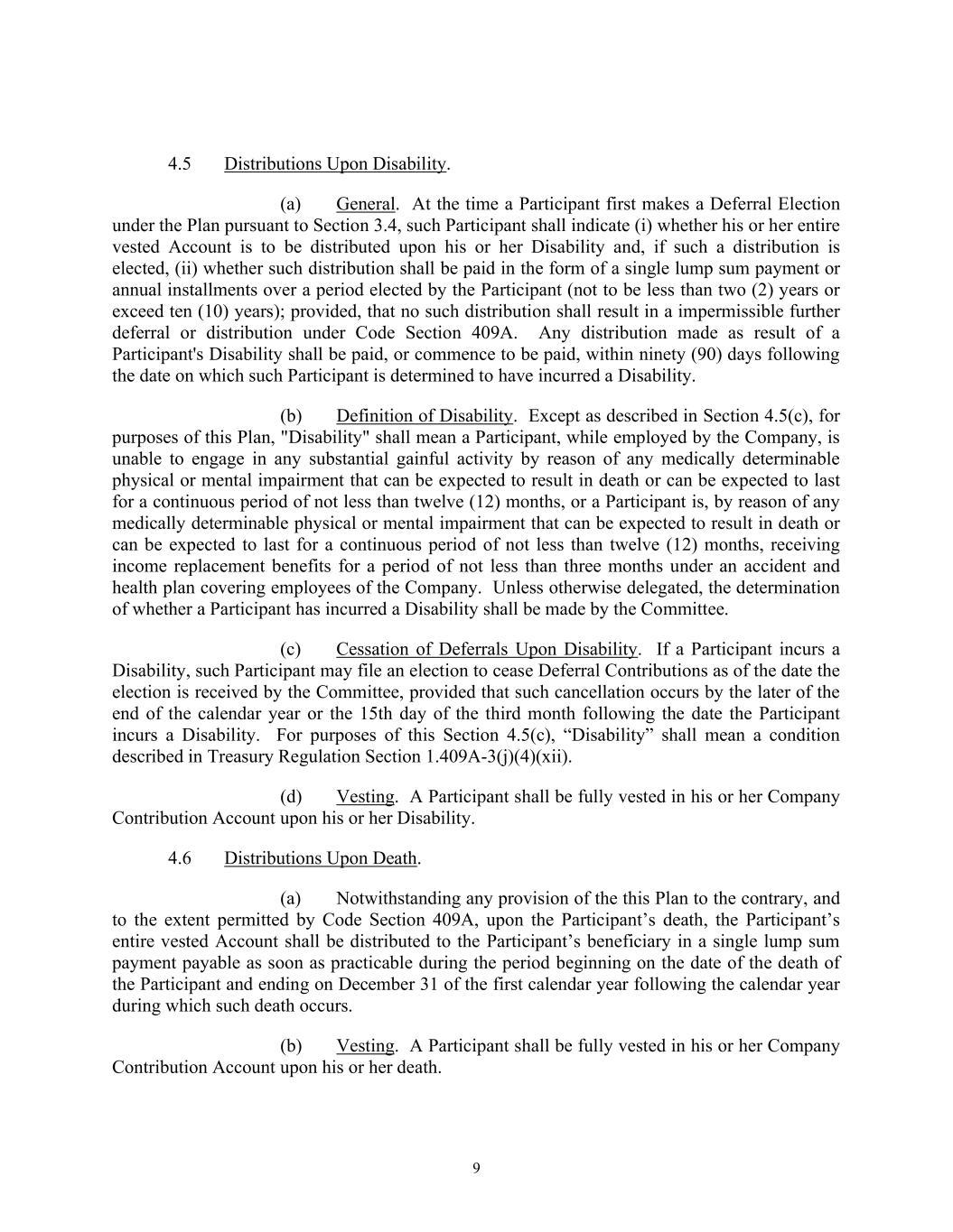 9 4.5 Distributions Upon Disability. (a) General. At the time a Participant first makes a Deferral Election under the Plan pursuant to Section 3.4, such Participant shall indicate (i) whether his or her entire vested Account is to be distributed upon his or her Disability and, if such a distribution is elected, (ii) whether such distribution shall be paid in the form of a single lump sum payment or annual installments over a period elected by the Participant (not to be less than two (2) years or exceed ten (10) years); provided, that no such distribution shall result in a impermissible further deferral or distribution under Code Section 409A. Any distribution made as result of a Participant's Disability shall be paid, or commence to be paid, within ninety (90) days following the date on which such Participant is determined to have incurred a Disability. (b) Definition of Disability. Except as described in Section 4.5(c), for purposes of this Plan, "Disability" shall mean a Participant, while employed by the Company, is unable to engage in any substantial gainful activity by reason of any medically determinable physical or mental impairment that can be expected to result in death or can be expected to last for a continuous period of not less than twelve (12) months, or a Participant is, by reason of any medically determinable physical or mental impairment that can be expected to result in death or can be expected to last for a continuous period of not less than twelve (12) months, receiving income replacement benefits for a period of not less than three months under an accident and health plan covering employees of the Company. Unless otherwise delegated, the determination of whether a Participant has incurred a Disability shall be made by the Committee. (c) Cessation of Deferrals Upon Disability. If a Participant incurs a Disability, such Participant may file an election to cease Deferral Contributions as of the date the election is received by the Committee, provided that such cancellation occurs by the later of the end of the calendar year or the 15th day of the third month following the date the Participant incurs a Disability. For purposes of this Section 4.5(c), “Disability” shall mean a condition described in Treasury Regulation Section 1.409A-3(j)(4)(xii). (d) Vesting. A Participant shall be fully vested in his or her Company Contribution Account upon his or her Disability. 4.6 Distributions Upon Death. (a) Notwithstanding any provision of the this Plan to the contrary, and to the extent permitted by Code Section 409A, upon the Participant’s death, the Participant’s entire vested Account shall be distributed to the Participant’s beneficiary in a single lump sum payment payable as soon as practicable during the period beginning on the date of the death of the Participant and ending on December 31 of the first calendar year following the calendar year during which such death occurs. (b) Vesting. A Participant shall be fully vested in his or her Company Contribution Account upon his or her death.