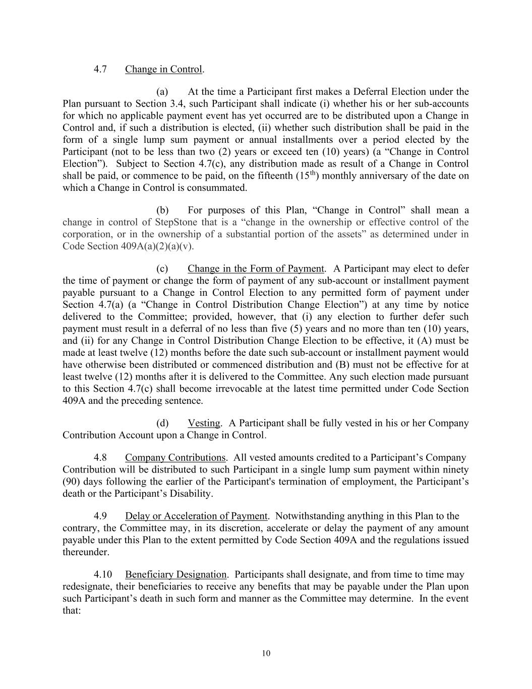 10 4.7 Change in Control. (a) At the time a Participant first makes a Deferral Election under the Plan pursuant to Section 3.4, such Participant shall indicate (i) whether his or her sub-accounts for which no applicable payment event has yet occurred are to be distributed upon a Change in Control and, if such a distribution is elected, (ii) whether such distribution shall be paid in the form of a single lump sum payment or annual installments over a period elected by the Participant (not to be less than two (2) years or exceed ten (10) years) (a “Change in Control Election”). Subject to Section 4.7(c), any distribution made as result of a Change in Control shall be paid, or commence to be paid, on the fifteenth (15th) monthly anniversary of the date on which a Change in Control is consummated. (b) For purposes of this Plan, “Change in Control” shall mean a change in control of StepStone that is a “change in the ownership or effective control of the corporation, or in the ownership of a substantial portion of the assets” as determined under in Code Section 409A(a)(2)(a)(v). (c) Change in the Form of Payment. A Participant may elect to defer the time of payment or change the form of payment of any sub-account or installment payment payable pursuant to a Change in Control Election to any permitted form of payment under Section 4.7(a) (a “Change in Control Distribution Change Election”) at any time by notice delivered to the Committee; provided, however, that (i) any election to further defer such payment must result in a deferral of no less than five (5) years and no more than ten (10) years, and (ii) for any Change in Control Distribution Change Election to be effective, it (A) must be made at least twelve (12) months before the date such sub-account or installment payment would have otherwise been distributed or commenced distribution and (B) must not be effective for at least twelve (12) months after it is delivered to the Committee. Any such election made pursuant to this Section 4.7(c) shall become irrevocable at the latest time permitted under Code Section 409A and the preceding sentence. (d) Vesting. A Participant shall be fully vested in his or her Company Contribution Account upon a Change in Control. 4.8 Company Contributions. All vested amounts credited to a Participant’s Company Contribution will be distributed to such Participant in a single lump sum payment within ninety (90) days following the earlier of the Participant's termination of employment, the Participant’s death or the Participant’s Disability. 4.9 Delay or Acceleration of Payment. Notwithstanding anything in this Plan to the contrary, the Committee may, in its discretion, accelerate or delay the payment of any amount payable under this Plan to the extent permitted by Code Section 409A and the regulations issued thereunder. 4.10 Beneficiary Designation. Participants shall designate, and from time to time may redesignate, their beneficiaries to receive any benefits that may be payable under the Plan upon such Participant’s death in such form and manner as the Committee may determine. In the event that: