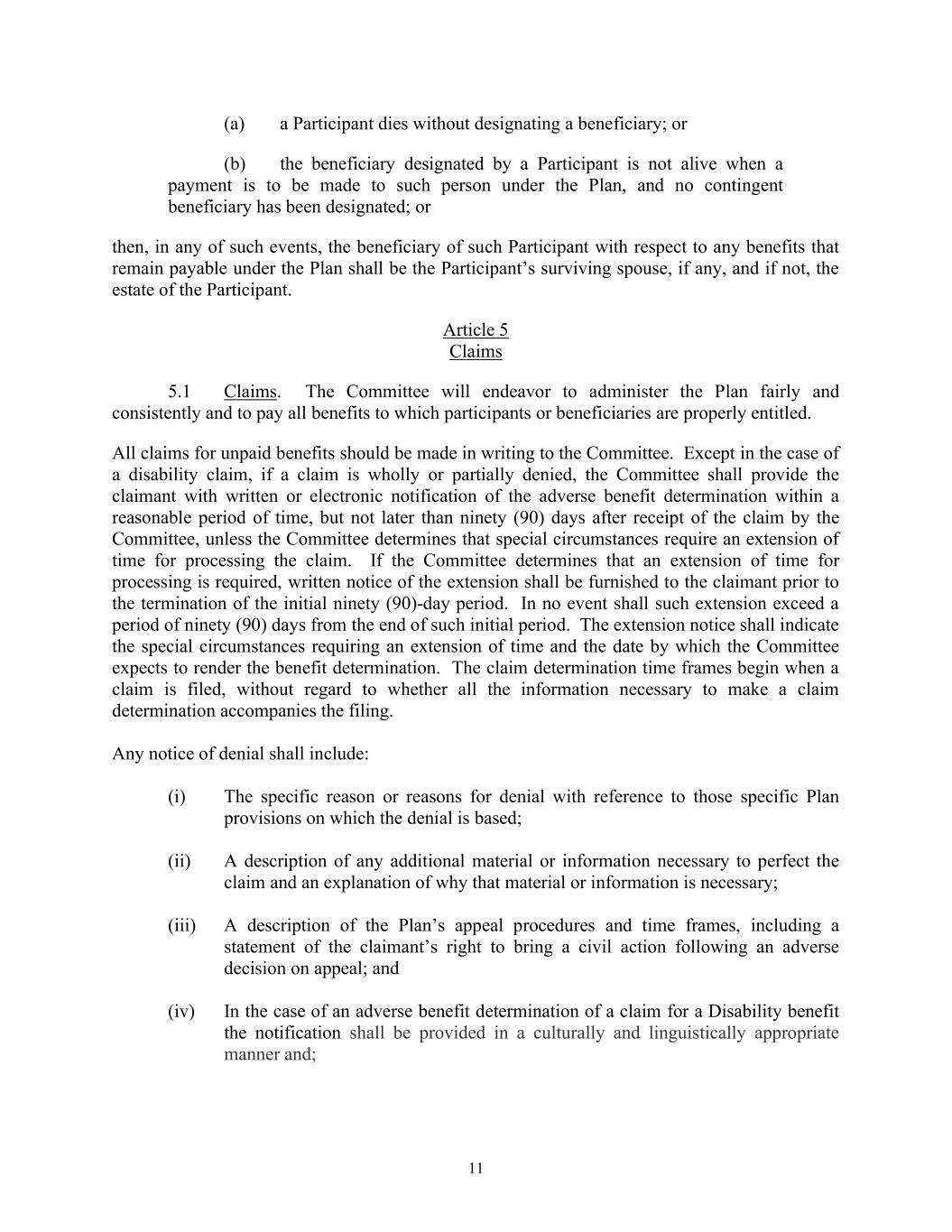 11 (a) a Participant dies without designating a beneficiary; or (b) the beneficiary designated by a Participant is not alive when a payment is to be made to such person under the Plan, and no contingent beneficiary has been designated; or then, in any of such events, the beneficiary of such Participant with respect to any benefits that remain payable under the Plan shall be the Participant’s surviving spouse, if any, and if not, the estate of the Participant. Article 5 Claims 5.1 Claims. The Committee will endeavor to administer the Plan fairly and consistently and to pay all benefits to which participants or beneficiaries are properly entitled. All claims for unpaid benefits should be made in writing to the Committee. Except in the case of a disability claim, if a claim is wholly or partially denied, the Committee shall provide the claimant with written or electronic notification of the adverse benefit determination within a reasonable period of time, but not later than ninety (90) days after receipt of the claim by the Committee, unless the Committee determines that special circumstances require an extension of time for processing the claim. If the Committee determines that an extension of time for processing is required, written notice of the extension shall be furnished to the claimant prior to the termination of the initial ninety (90)-day period. In no event shall such extension exceed a period of ninety (90) days from the end of such initial period. The extension notice shall indicate the special circumstances requiring an extension of time and the date by which the Committee expects to render the benefit determination. The claim determination time frames begin when a claim is filed, without regard to whether all the information necessary to make a claim determination accompanies the filing. Any notice of denial shall include: (i) The specific reason or reasons for denial with reference to those specific Plan provisions on which the denial is based; (ii) A description of any additional material or information necessary to perfect the claim and an explanation of why that material or information is necessary; (iii) A description of the Plan’s appeal procedures and time frames, including a statement of the claimant’s right to bring a civil action following an adverse decision on appeal; and (iv) In the case of an adverse benefit determination of a claim for a Disability benefit the notification shall be provided in a culturally and linguistically appropriate manner and;