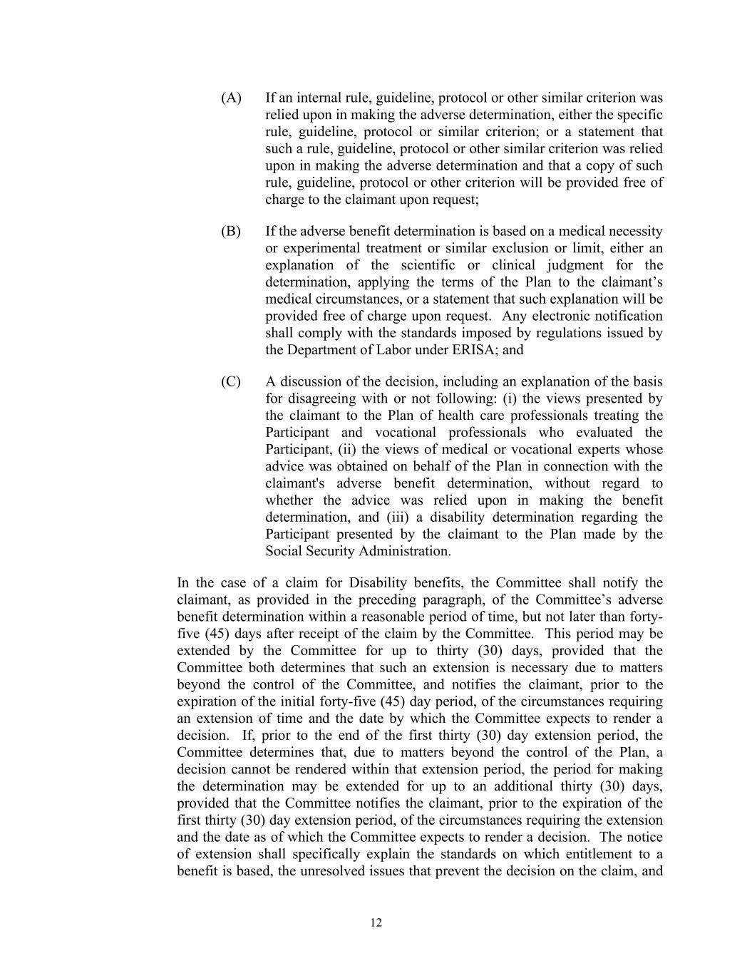 12 (A) If an internal rule, guideline, protocol or other similar criterion was relied upon in making the adverse determination, either the specific rule, guideline, protocol or similar criterion; or a statement that such a rule, guideline, protocol or other similar criterion was relied upon in making the adverse determination and that a copy of such rule, guideline, protocol or other criterion will be provided free of charge to the claimant upon request; (B) If the adverse benefit determination is based on a medical necessity or experimental treatment or similar exclusion or limit, either an explanation of the scientific or clinical judgment for the determination, applying the terms of the Plan to the claimant’s medical circumstances, or a statement that such explanation will be provided free of charge upon request. Any electronic notification shall comply with the standards imposed by regulations issued by the Department of Labor under ERISA; and (C) A discussion of the decision, including an explanation of the basis for disagreeing with or not following: (i) the views presented by the claimant to the Plan of health care professionals treating the Participant and vocational professionals who evaluated the Participant, (ii) the views of medical or vocational experts whose advice was obtained on behalf of the Plan in connection with the claimant's adverse benefit determination, without regard to whether the advice was relied upon in making the benefit determination, and (iii) a disability determination regarding the Participant presented by the claimant to the Plan made by the Social Security Administration. In the case of a claim for Disability benefits, the Committee shall notify the claimant, as provided in the preceding paragraph, of the Committee’s adverse benefit determination within a reasonable period of time, but not later than forty- five (45) days after receipt of the claim by the Committee. This period may be extended by the Committee for up to thirty (30) days, provided that the Committee both determines that such an extension is necessary due to matters beyond the control of the Committee, and notifies the claimant, prior to the expiration of the initial forty-five (45) day period, of the circumstances requiring an extension of time and the date by which the Committee expects to render a decision. If, prior to the end of the first thirty (30) day extension period, the Committee determines that, due to matters beyond the control of the Plan, a decision cannot be rendered within that extension period, the period for making the determination may be extended for up to an additional thirty (30) days, provided that the Committee notifies the claimant, prior to the expiration of the first thirty (30) day extension period, of the circumstances requiring the extension and the date as of which the Committee expects to render a decision. The notice of extension shall specifically explain the standards on which entitlement to a benefit is based, the unresolved issues that prevent the decision on the claim, and