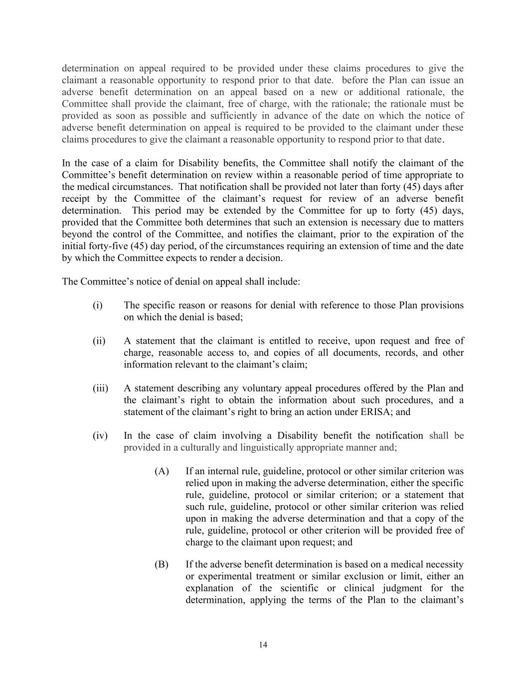 14 determination on appeal required to be provided under these claims procedures to give the claimant a reasonable opportunity to respond prior to that date. before the Plan can issue an adverse benefit determination on an appeal based on a new or additional rationale, the Committee shall provide the claimant, free of charge, with the rationale; the rationale must be provided as soon as possible and sufficiently in advance of the date on which the notice of adverse benefit determination on appeal is required to be provided to the claimant under these claims procedures to give the claimant a reasonable opportunity to respond prior to that date. In the case of a claim for Disability benefits, the Committee shall notify the claimant of the Committee’s benefit determination on review within a reasonable period of time appropriate to the medical circumstances. That notification shall be provided not later than forty (45) days after receipt by the Committee of the claimant’s request for review of an adverse benefit determination. This period may be extended by the Committee for up to forty (45) days, provided that the Committee both determines that such an extension is necessary due to matters beyond the control of the Committee, and notifies the claimant, prior to the expiration of the initial forty-five (45) day period, of the circumstances requiring an extension of time and the date by which the Committee expects to render a decision. The Committee’s notice of denial on appeal shall include: (i) The specific reason or reasons for denial with reference to those Plan provisions on which the denial is based; (ii) A statement that the claimant is entitled to receive, upon request and free of charge, reasonable access to, and copies of all documents, records, and other information relevant to the claimant’s claim; (iii) A statement describing any voluntary appeal procedures offered by the Plan and the claimant’s right to obtain the information about such procedures, and a statement of the claimant’s right to bring an action under ERISA; and (iv) In the case of claim involving a Disability benefit the notification shall be provided in a culturally and linguistically appropriate manner and; (A) If an internal rule, guideline, protocol or other similar criterion was relied upon in making the adverse determination, either the specific rule, guideline, protocol or similar criterion; or a statement that such rule, guideline, protocol or other similar criterion was relied upon in making the adverse determination and that a copy of the rule, guideline, protocol or other criterion will be provided free of charge to the claimant upon request; and (B) If the adverse benefit determination is based on a medical necessity or experimental treatment or similar exclusion or limit, either an explanation of the scientific or clinical judgment for the determination, applying the terms of the Plan to the claimant’s