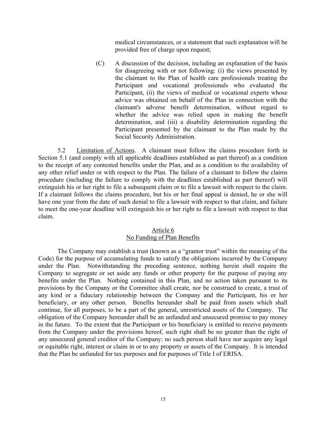 15 medical circumstances, or a statement that such explanation will be provided free of charge upon request; (C) A discussion of the decision, including an explanation of the basis for disagreeing with or not following: (i) the views presented by the claimant to the Plan of health care professionals treating the Participant and vocational professionals who evaluated the Participant, (ii) the views of medical or vocational experts whose advice was obtained on behalf of the Plan in connection with the claimant's adverse benefit determination, without regard to whether the advice was relied upon in making the benefit determination, and (iii) a disability determination regarding the Participant presented by the claimant to the Plan made by the Social Security Administration. 5.2 Limitation of Actions. A claimant must follow the claims procedure forth in Section 5.1 (and comply with all applicable deadlines established as part thereof) as a condition to the receipt of any contested benefits under the Plan, and as a condition to the availability of any other relief under or with respect to the Plan. The failure of a claimant to follow the claims procedure (including the failure to comply with the deadlines established as part thereof) will extinguish his or her right to file a subsequent claim or to file a lawsuit with respect to the claim. If a claimant follows the claims procedure, but his or her final appeal is denied, he or she will have one year from the date of such denial to file a lawsuit with respect to that claim, and failure to meet the one-year deadline will extinguish his or her right to file a lawsuit with respect to that claim. Article 6 No Funding of Plan Benefits The Company may establish a trust (known as a “grantor trust” within the meaning of the Code) for the purpose of accumulating funds to satisfy the obligations incurred by the Company under the Plan. Notwithstanding the preceding sentence, nothing herein shall require the Company to segregate or set aside any funds or other property for the purpose of paying any benefits under the Plan. Nothing contained in this Plan, and no action taken pursuant to its provisions by the Company or the Committee shall create, nor be construed to create, a trust of any kind or a fiduciary relationship between the Company and the Participant, his or her beneficiary, or any other person. Benefits hereunder shall be paid from assets which shall continue, for all purposes, to be a part of the general, unrestricted assets of the Company. The obligation of the Company hereunder shall be an unfunded and unsecured promise to pay money in the future. To the extent that the Participant or his beneficiary is entitled to receive payments from the Company under the provisions hereof, such right shall be no greater than the right of any unsecured general creditor of the Company; no such person shall have nor acquire any legal or equitable right, interest or claim in or to any property or assets of the Company. It is intended that the Plan be unfunded for tax purposes and for purposes of Title I of ERISA.