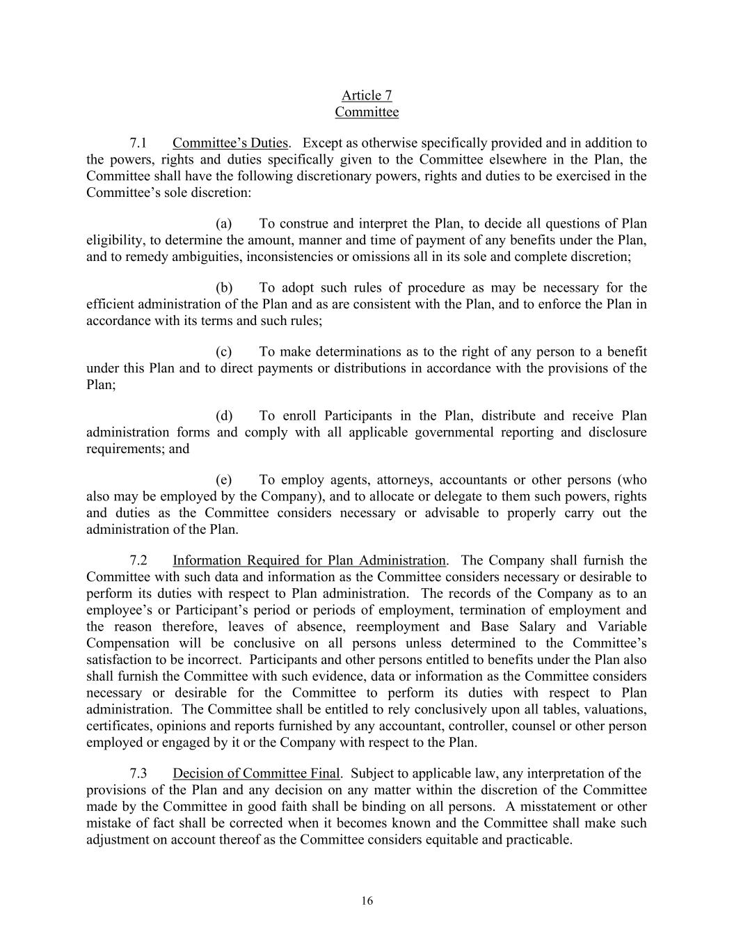 16 Article 7 Committee 7.1 Committee’s Duties. Except as otherwise specifically provided and in addition to the powers, rights and duties specifically given to the Committee elsewhere in the Plan, the Committee shall have the following discretionary powers, rights and duties to be exercised in the Committee’s sole discretion: (a) To construe and interpret the Plan, to decide all questions of Plan eligibility, to determine the amount, manner and time of payment of any benefits under the Plan, and to remedy ambiguities, inconsistencies or omissions all in its sole and complete discretion; (b) To adopt such rules of procedure as may be necessary for the efficient administration of the Plan and as are consistent with the Plan, and to enforce the Plan in accordance with its terms and such rules; (c) To make determinations as to the right of any person to a benefit under this Plan and to direct payments or distributions in accordance with the provisions of the Plan; (d) To enroll Participants in the Plan, distribute and receive Plan administration forms and comply with all applicable governmental reporting and disclosure requirements; and (e) To employ agents, attorneys, accountants or other persons (who also may be employed by the Company), and to allocate or delegate to them such powers, rights and duties as the Committee considers necessary or advisable to properly carry out the administration of the Plan. 7.2 Information Required for Plan Administration. The Company shall furnish the Committee with such data and information as the Committee considers necessary or desirable to perform its duties with respect to Plan administration. The records of the Company as to an employee’s or Participant’s period or periods of employment, termination of employment and the reason therefore, leaves of absence, reemployment and Base Salary and Variable Compensation will be conclusive on all persons unless determined to the Committee’s satisfaction to be incorrect. Participants and other persons entitled to benefits under the Plan also shall furnish the Committee with such evidence, data or information as the Committee considers necessary or desirable for the Committee to perform its duties with respect to Plan administration. The Committee shall be entitled to rely conclusively upon all tables, valuations, certificates, opinions and reports furnished by any accountant, controller, counsel or other person employed or engaged by it or the Company with respect to the Plan. 7.3 Decision of Committee Final. Subject to applicable law, any interpretation of the provisions of the Plan and any decision on any matter within the discretion of the Committee made by the Committee in good faith shall be binding on all persons. A misstatement or other mistake of fact shall be corrected when it becomes known and the Committee shall make such adjustment on account thereof as the Committee considers equitable and practicable.