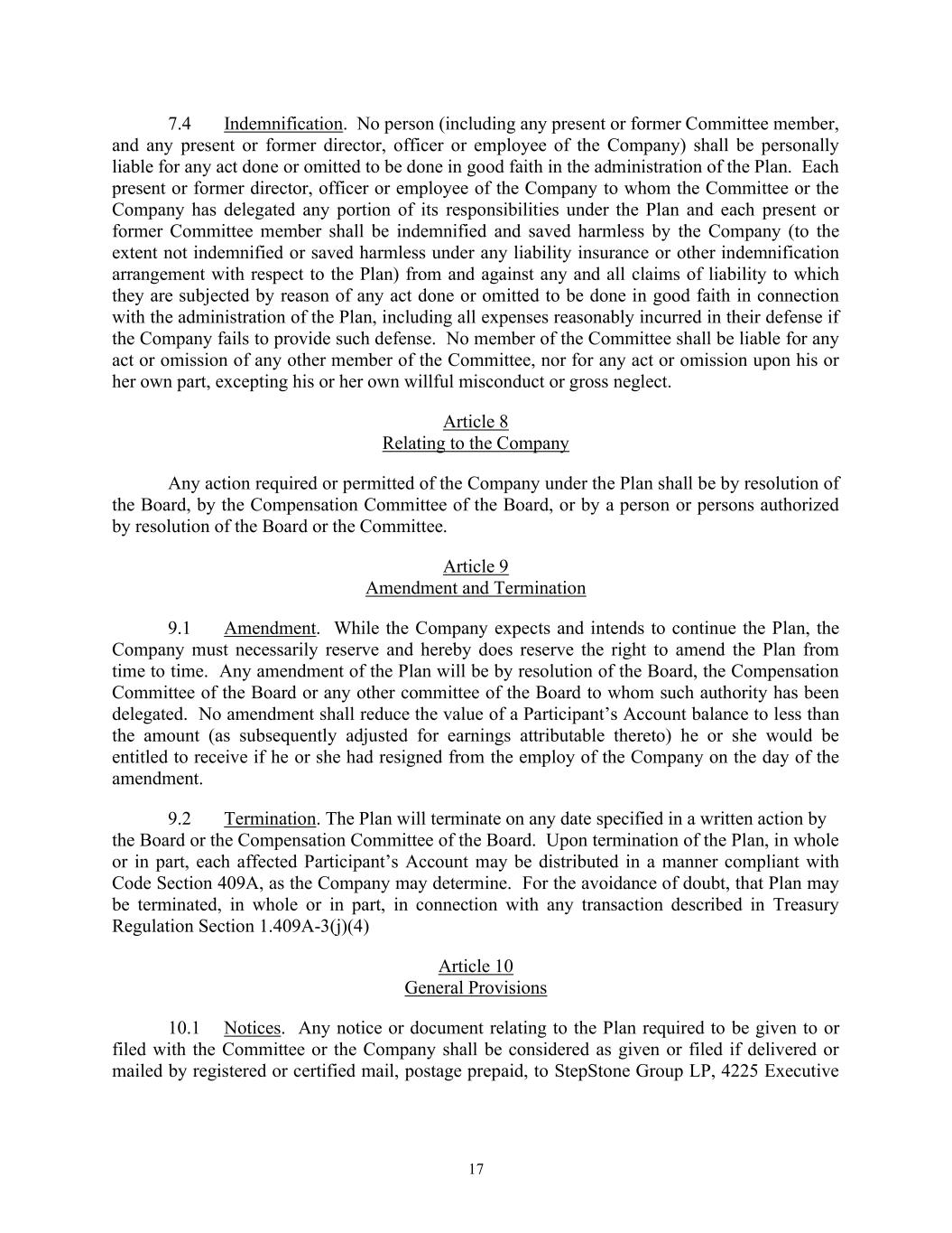 17 7.4 Indemnification. No person (including any present or former Committee member, and any present or former director, officer or employee of the Company) shall be personally liable for any act done or omitted to be done in good faith in the administration of the Plan. Each present or former director, officer or employee of the Company to whom the Committee or the Company has delegated any portion of its responsibilities under the Plan and each present or former Committee member shall be indemnified and saved harmless by the Company (to the extent not indemnified or saved harmless under any liability insurance or other indemnification arrangement with respect to the Plan) from and against any and all claims of liability to which they are subjected by reason of any act done or omitted to be done in good faith in connection with the administration of the Plan, including all expenses reasonably incurred in their defense if the Company fails to provide such defense. No member of the Committee shall be liable for any act or omission of any other member of the Committee, nor for any act or omission upon his or her own part, excepting his or her own willful misconduct or gross neglect. Article 8 Relating to the Company Any action required or permitted of the Company under the Plan shall be by resolution of the Board, by the Compensation Committee of the Board, or by a person or persons authorized by resolution of the Board or the Committee. Article 9 Amendment and Termination 9.1 Amendment. While the Company expects and intends to continue the Plan, the Company must necessarily reserve and hereby does reserve the right to amend the Plan from time to time. Any amendment of the Plan will be by resolution of the Board, the Compensation Committee of the Board or any other committee of the Board to whom such authority has been delegated. No amendment shall reduce the value of a Participant’s Account balance to less than the amount (as subsequently adjusted for earnings attributable thereto) he or she would be entitled to receive if he or she had resigned from the employ of the Company on the day of the amendment. 9.2 Termination. The Plan will terminate on any date specified in a written action by the Board or the Compensation Committee of the Board. Upon termination of the Plan, in whole or in part, each affected Participant’s Account may be distributed in a manner compliant with Code Section 409A, as the Company may determine. For the avoidance of doubt, that Plan may be terminated, in whole or in part, in connection with any transaction described in Treasury Regulation Section 1.409A-3(j)(4) Article 10 General Provisions 10.1 Notices. Any notice or document relating to the Plan required to be given to or filed with the Committee or the Company shall be considered as given or filed if delivered or mailed by registered or certified mail, postage prepaid, to StepStone Group LP, 4225 Executive