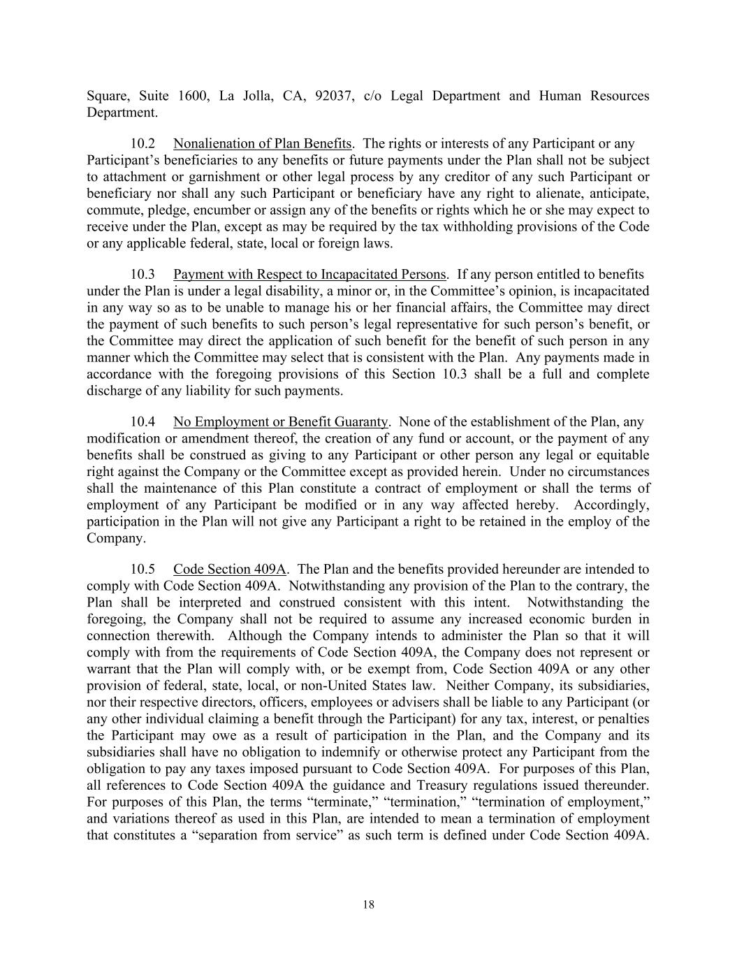 18 Square, Suite 1600, La Jolla, CA, 92037, c/o Legal Department and Human Resources Department. 10.2 Nonalienation of Plan Benefits. The rights or interests of any Participant or any Participant’s beneficiaries to any benefits or future payments under the Plan shall not be subject to attachment or garnishment or other legal process by any creditor of any such Participant or beneficiary nor shall any such Participant or beneficiary have any right to alienate, anticipate, commute, pledge, encumber or assign any of the benefits or rights which he or she may expect to receive under the Plan, except as may be required by the tax withholding provisions of the Code or any applicable federal, state, local or foreign laws. 10.3 Payment with Respect to Incapacitated Persons. If any person entitled to benefits under the Plan is under a legal disability, a minor or, in the Committee’s opinion, is incapacitated in any way so as to be unable to manage his or her financial affairs, the Committee may direct the payment of such benefits to such person’s legal representative for such person’s benefit, or the Committee may direct the application of such benefit for the benefit of such person in any manner which the Committee may select that is consistent with the Plan. Any payments made in accordance with the foregoing provisions of this Section 10.3 shall be a full and complete discharge of any liability for such payments. 10.4 No Employment or Benefit Guaranty. None of the establishment of the Plan, any modification or amendment thereof, the creation of any fund or account, or the payment of any benefits shall be construed as giving to any Participant or other person any legal or equitable right against the Company or the Committee except as provided herein. Under no circumstances shall the maintenance of this Plan constitute a contract of employment or shall the terms of employment of any Participant be modified or in any way affected hereby. Accordingly, participation in the Plan will not give any Participant a right to be retained in the employ of the Company. 10.5 Code Section 409A. The Plan and the benefits provided hereunder are intended to comply with Code Section 409A. Notwithstanding any provision of the Plan to the contrary, the Plan shall be interpreted and construed consistent with this intent. Notwithstanding the foregoing, the Company shall not be required to assume any increased economic burden in connection therewith. Although the Company intends to administer the Plan so that it will comply with from the requirements of Code Section 409A, the Company does not represent or warrant that the Plan will comply with, or be exempt from, Code Section 409A or any other provision of federal, state, local, or non-United States law. Neither Company, its subsidiaries, nor their respective directors, officers, employees or advisers shall be liable to any Participant (or any other individual claiming a benefit through the Participant) for any tax, interest, or penalties the Participant may owe as a result of participation in the Plan, and the Company and its subsidiaries shall have no obligation to indemnify or otherwise protect any Participant from the obligation to pay any taxes imposed pursuant to Code Section 409A. For purposes of this Plan, all references to Code Section 409A the guidance and Treasury regulations issued thereunder. For purposes of this Plan, the terms “terminate,” “termination,” “termination of employment,” and variations thereof as used in this Plan, are intended to mean a termination of employment that constitutes a “separation from service” as such term is defined under Code Section 409A.