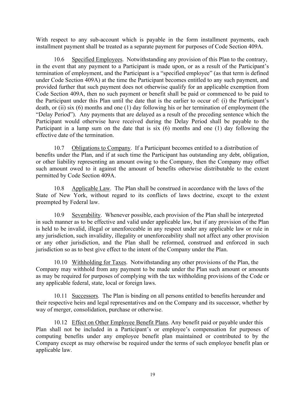 19 With respect to any sub-account which is payable in the form installment payments, each installment payment shall be treated as a separate payment for purposes of Code Section 409A. 10.6 Specified Employees. Notwithstanding any provision of this Plan to the contrary, in the event that any payment to a Participant is made upon, or as a result of the Participant’s termination of employment, and the Participant is a “specified employee” (as that term is defined under Code Section 409A) at the time the Participant becomes entitled to any such payment, and provided further that such payment does not otherwise qualify for an applicable exemption from Code Section 409A, then no such payment or benefit shall be paid or commenced to be paid to the Participant under this Plan until the date that is the earlier to occur of: (i) the Participant’s death, or (ii) six (6) months and one (1) day following his or her termination of employment (the “Delay Period”). Any payments that are delayed as a result of the preceding sentence which the Participant would otherwise have received during the Delay Period shall be payable to the Participant in a lump sum on the date that is six (6) months and one (1) day following the effective date of the termination. 10.7 Obligations to Company. If a Participant becomes entitled to a distribution of benefits under the Plan, and if at such time the Participant has outstanding any debt, obligation, or other liability representing an amount owing to the Company, then the Company may offset such amount owed to it against the amount of benefits otherwise distributable to the extent permitted by Code Section 409A. 10.8 Applicable Law. The Plan shall be construed in accordance with the laws of the State of New York, without regard to its conflicts of laws doctrine, except to the extent preempted by Federal law. 10.9 Severability. Whenever possible, each provision of the Plan shall be interpreted in such manner as to be effective and valid under applicable law, but if any provision of the Plan is held to be invalid, illegal or unenforceable in any respect under any applicable law or rule in any jurisdiction, such invalidity, illegality or unenforceability shall not affect any other provision or any other jurisdiction, and the Plan shall be reformed, construed and enforced in such jurisdiction so as to best give effect to the intent of the Company under the Plan. 10.10 Withholding for Taxes. Notwithstanding any other provisions of the Plan, the Company may withhold from any payment to be made under the Plan such amount or amounts as may be required for purposes of complying with the tax withholding provisions of the Code or any applicable federal, state, local or foreign laws. 10.11 Successors. The Plan is binding on all persons entitled to benefits hereunder and their respective heirs and legal representatives and on the Company and its successor, whether by way of merger, consolidation, purchase or otherwise. 10.12 Effect on Other Employee Benefit Plans. Any benefit paid or payable under this Plan shall not be included in a Participant’s or employee’s compensation for purposes of computing benefits under any employee benefit plan maintained or contributed to by the Company except as may otherwise be required under the terms of such employee benefit plan or applicable law.