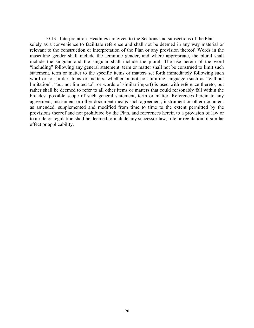 20 10.13 Interpretation. Headings are given to the Sections and subsections of the Plan solely as a convenience to facilitate reference and shall not be deemed in any way material or relevant to the construction or interpretation of the Plan or any provision thereof. Words in the masculine gender shall include the feminine gender, and where appropriate, the plural shall include the singular and the singular shall include the plural. The use herein of the word “including” following any general statement, term or matter shall not be construed to limit such statement, term or matter to the specific items or matters set forth immediately following such word or to similar items or matters, whether or not non-limiting language (such as “without limitation”, “but not limited to”, or words of similar import) is used with reference thereto, but rather shall be deemed to refer to all other items or matters that could reasonably fall within the broadest possible scope of such general statement, term or matter. References herein to any agreement, instrument or other document means such agreement, instrument or other document as amended, supplemented and modified from time to time to the extent permitted by the provisions thereof and not prohibited by the Plan, and references herein to a provision of law or to a rule or regulation shall be deemed to include any successor law, rule or regulation of similar effect or applicability.