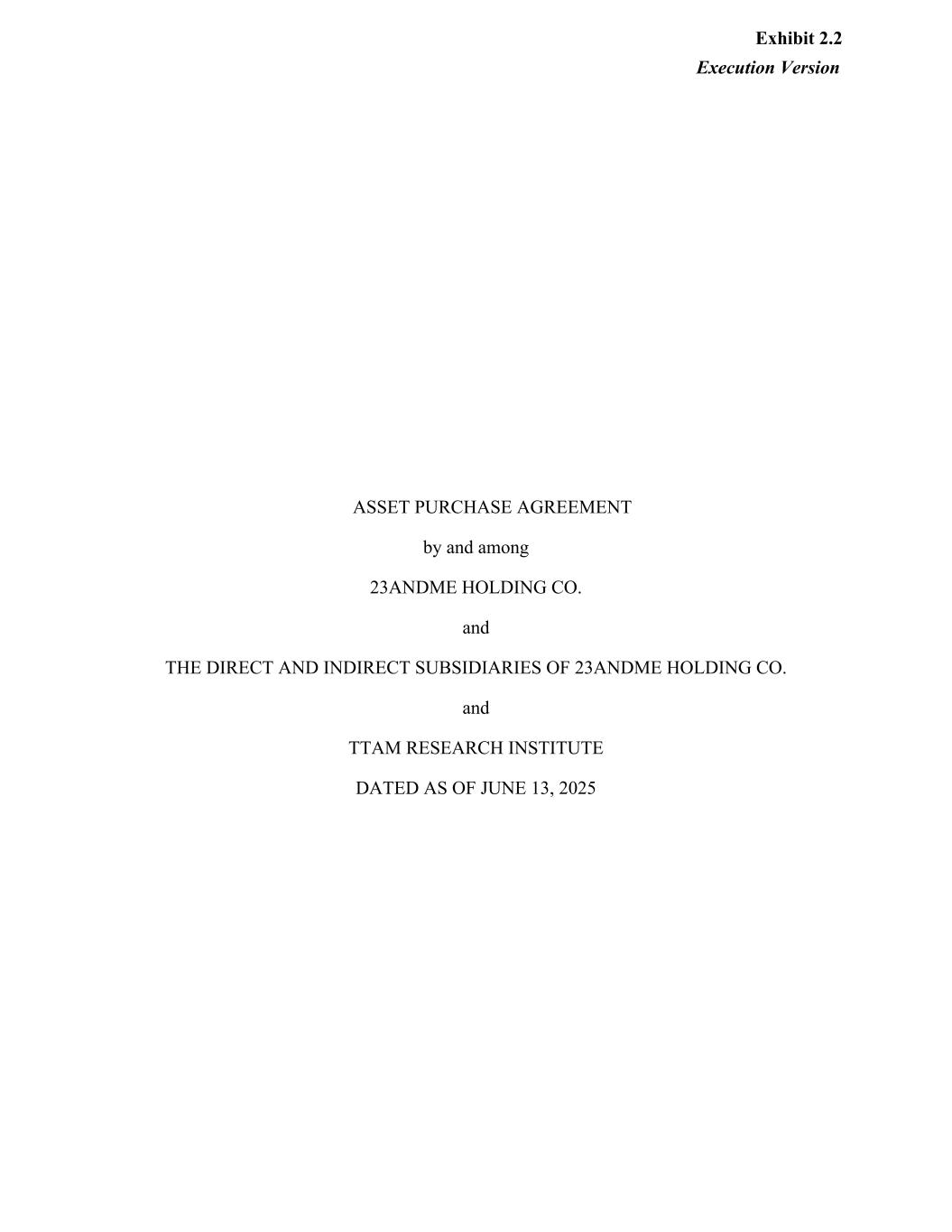 Execution Version ASSET PURCHASE AGREEMENT by and among 23ANDME HOLDING CO. and THE DIRECT AND INDIRECT SUBSIDIARIES OF 23ANDME HOLDING CO. and TTAM RESEARCH INSTITUTE DATED AS OF JUNE 13, 2025 Exhibit 2.2