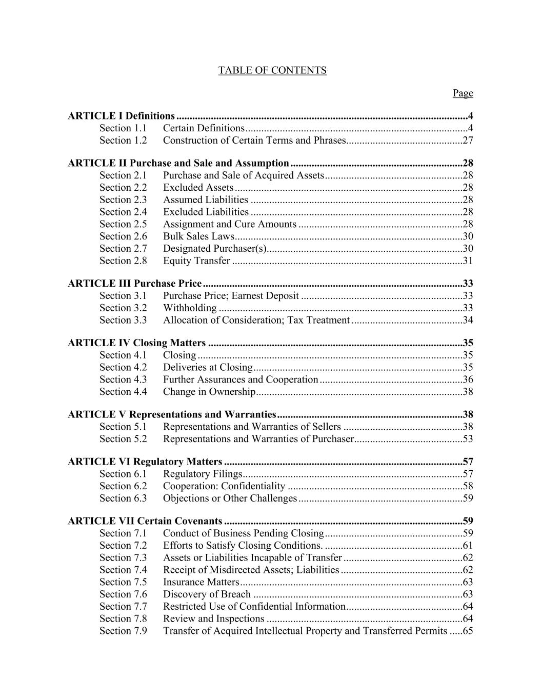 TABLE OF CONTENTS Page ARTICLE I Definitions ..............................................................................................................4 Section 1.1 Certain Definitions....................................................................................4 Section 1.2 Construction of Certain Terms and Phrases............................................27 ARTICLE II Purchase and Sale and Assumption.................................................................28 Section 2.1 Purchase and Sale of Acquired Assets....................................................28 Section 2.2 Excluded Assets ......................................................................................28 Section 2.3 Assumed Liabilities ................................................................................28 Section 2.4 Excluded Liabilities ................................................................................28 Section 2.5 Assignment and Cure Amounts ..............................................................28 Section 2.6 Bulk Sales Laws......................................................................................30 Section 2.7 Designated Purchaser(s)..........................................................................30 Section 2.8 Equity Transfer .......................................................................................31 ARTICLE III Purchase Price ..................................................................................................33 Section 3.1 Purchase Price; Earnest Deposit .............................................................33 Section 3.2 Withholding ............................................................................................33 Section 3.3 Allocation of Consideration; Tax Treatment ..........................................34 ARTICLE IV Closing Matters ................................................................................................35 Section 4.1 Closing ....................................................................................................35 Section 4.2 Deliveries at Closing...............................................................................35 Section 4.3 Further Assurances and Cooperation ......................................................36 Section 4.4 Change in Ownership..............................................................................38 ARTICLE V Representations and Warranties......................................................................38 Section 5.1 Representations and Warranties of Sellers .............................................38 Section 5.2 Representations and Warranties of Purchaser.........................................53 ARTICLE VI Regulatory Matters ..........................................................................................57 Section 6.1 Regulatory Filings...................................................................................57 Section 6.2 Cooperation: Confidentiality ..................................................................58 Section 6.3 Objections or Other Challenges ..............................................................59 ARTICLE VII Certain Covenants ..........................................................................................59 Section 7.1 Conduct of Business Pending Closing....................................................59 Section 7.2 Efforts to Satisfy Closing Conditions. ....................................................61 Section 7.3 Assets or Liabilities Incapable of Transfer .............................................62 Section 7.4 Receipt of Misdirected Assets; Liabilities ..............................................62 Section 7.5 Insurance Matters....................................................................................63 Section 7.6 Discovery of Breach ...............................................................................63 Section 7.7 Restricted Use of Confidential Information............................................64 Section 7.8 Review and Inspections ..........................................................................64 Section 7.9 Transfer of Acquired Intellectual Property and Transferred Permits .....65