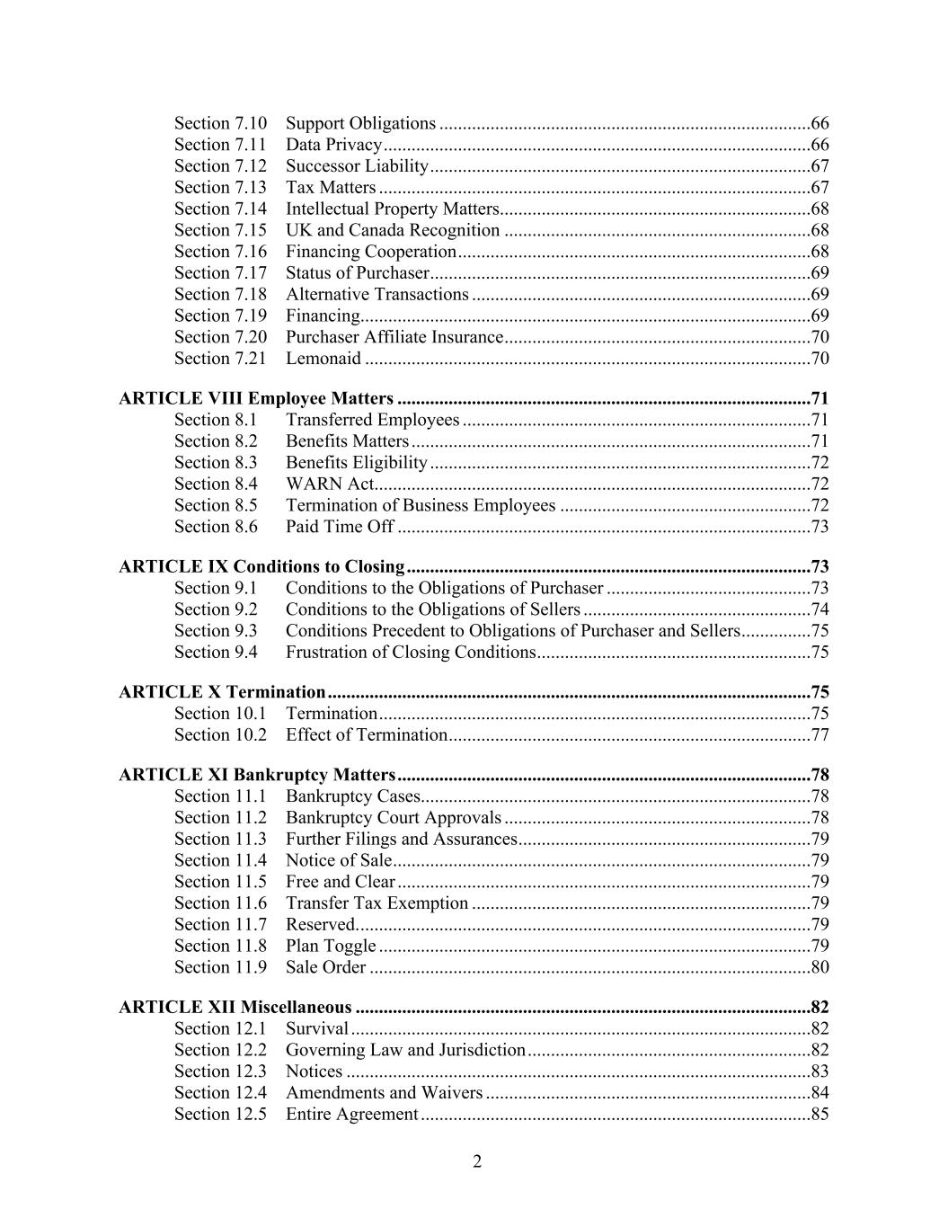 2 Section 7.10 Support Obligations ................................................................................66 Section 7.11 Data Privacy............................................................................................66 Section 7.12 Successor Liability..................................................................................67 Section 7.13 Tax Matters .............................................................................................67 Section 7.14 Intellectual Property Matters...................................................................68 Section 7.15 UK and Canada Recognition ..................................................................68 Section 7.16 Financing Cooperation............................................................................68 Section 7.17 Status of Purchaser..................................................................................69 Section 7.18 Alternative Transactions .........................................................................69 Section 7.19 Financing.................................................................................................69 Section 7.20 Purchaser Affiliate Insurance..................................................................70 Section 7.21 Lemonaid ................................................................................................70 ARTICLE VIII Employee Matters .........................................................................................71 Section 8.1 Transferred Employees ...........................................................................71 Section 8.2 Benefits Matters ......................................................................................71 Section 8.3 Benefits Eligibility ..................................................................................72 Section 8.4 WARN Act..............................................................................................72 Section 8.5 Termination of Business Employees ......................................................72 Section 8.6 Paid Time Off .........................................................................................73 ARTICLE IX Conditions to Closing.......................................................................................73 Section 9.1 Conditions to the Obligations of Purchaser ............................................73 Section 9.2 Conditions to the Obligations of Sellers .................................................74 Section 9.3 Conditions Precedent to Obligations of Purchaser and Sellers...............75 Section 9.4 Frustration of Closing Conditions...........................................................75 ARTICLE X Termination........................................................................................................75 Section 10.1 Termination.............................................................................................75 Section 10.2 Effect of Termination..............................................................................77 ARTICLE XI Bankruptcy Matters.........................................................................................78 Section 11.1 Bankruptcy Cases....................................................................................78 Section 11.2 Bankruptcy Court Approvals ..................................................................78 Section 11.3 Further Filings and Assurances...............................................................79 Section 11.4 Notice of Sale..........................................................................................79 Section 11.5 Free and Clear .........................................................................................79 Section 11.6 Transfer Tax Exemption .........................................................................79 Section 11.7 Reserved..................................................................................................79 Section 11.8 Plan Toggle .............................................................................................79 Section 11.9 Sale Order ...............................................................................................80 ARTICLE XII Miscellaneous ..................................................................................................82 Section 12.1 Survival ...................................................................................................82 Section 12.2 Governing Law and Jurisdiction.............................................................82 Section 12.3 Notices ....................................................................................................83 Section 12.4 Amendments and Waivers ......................................................................84 Section 12.5 Entire Agreement ....................................................................................85