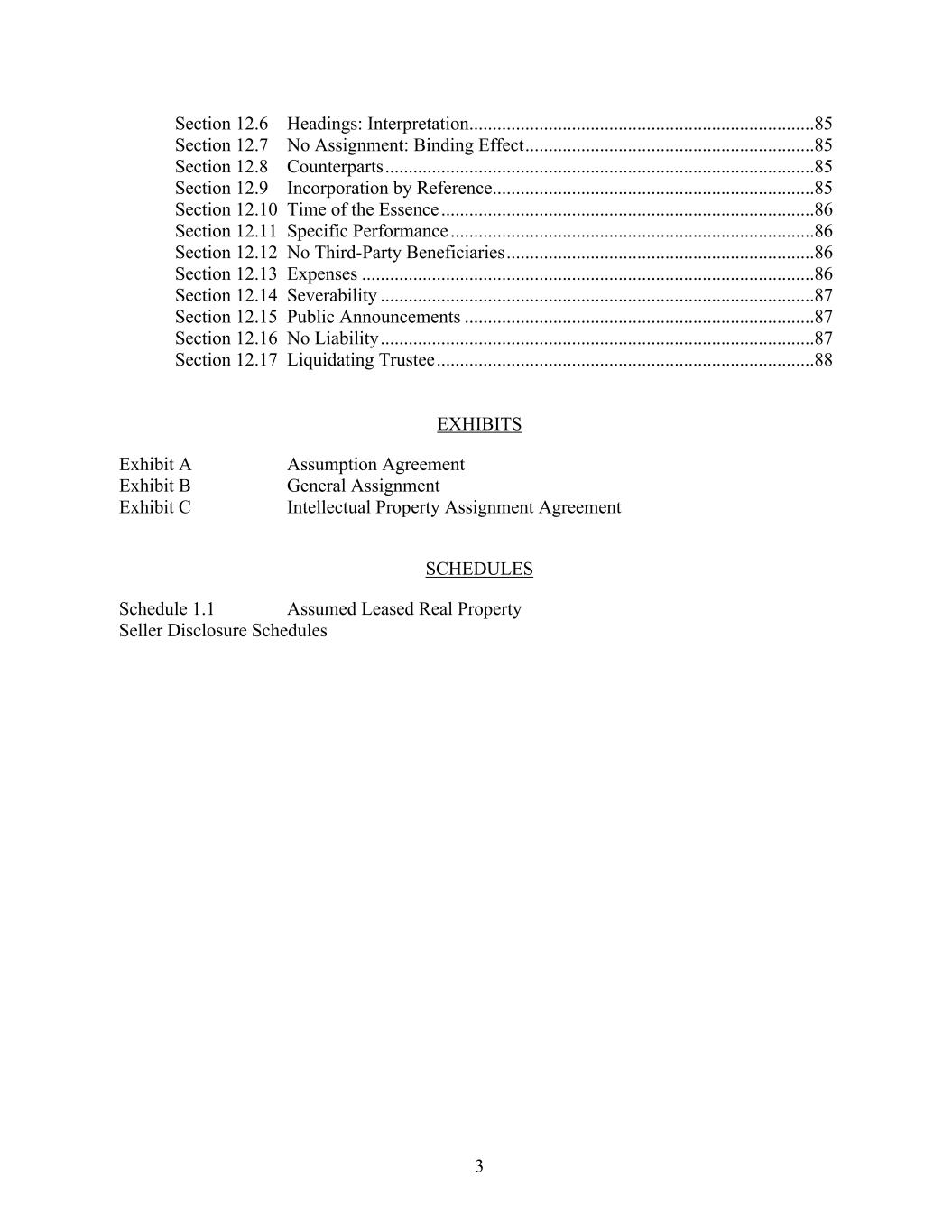 3 Section 12.6 Headings: Interpretation..........................................................................85 Section 12.7 No Assignment: Binding Effect..............................................................85 Section 12.8 Counterparts............................................................................................85 Section 12.9 Incorporation by Reference.....................................................................85 Section 12.10 Time of the Essence ................................................................................86 Section 12.11 Specific Performance ..............................................................................86 Section 12.12 No Third-Party Beneficiaries..................................................................86 Section 12.13 Expenses .................................................................................................86 Section 12.14 Severability .............................................................................................87 Section 12.15 Public Announcements ...........................................................................87 Section 12.16 No Liability.............................................................................................87 Section 12.17 Liquidating Trustee.................................................................................88 EXHIBITS Exhibit A Assumption Agreement Exhibit B General Assignment Exhibit C Intellectual Property Assignment Agreement SCHEDULES Schedule 1.1 Assumed Leased Real Property Seller Disclosure Schedules