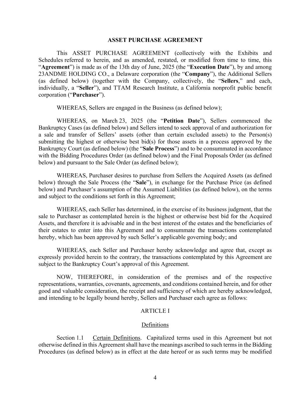 4 ASSET PURCHASE AGREEMENT This ASSET PURCHASE AGREEMENT (collectively with the Exhibits and Schedules referred to herein, and as amended, restated, or modified from time to time, this “Agreement”) is made as of the 13th day of June, 2025 (the “Execution Date”), by and among 23ANDME HOLDING CO., a Delaware corporation (the “Company”), the Additional Sellers (as defined below) (together with the Company, collectively, the “Sellers,” and each, individually, a “Seller”), and TTAM Research Institute, a California nonprofit public benefit corporation (“Purchaser”). WHEREAS, Sellers are engaged in the Business (as defined below); WHEREAS, on March 23, 2025 (the “Petition Date”), Sellers commenced the Bankruptcy Cases (as defined below) and Sellers intend to seek approval of and authorization for a sale and transfer of Sellers’ assets (other than certain excluded assets) to the Person(s) submitting the highest or otherwise best bid(s) for those assets in a process approved by the Bankruptcy Court (as defined below) (the “Sale Process”) and to be consummated in accordance with the Bidding Procedures Order (as defined below) and the Final Proposals Order (as defined below) and pursuant to the Sale Order (as defined below); WHEREAS, Purchaser desires to purchase from Sellers the Acquired Assets (as defined below) through the Sale Process (the “Sale”), in exchange for the Purchase Price (as defined below) and Purchaser’s assumption of the Assumed Liabilities (as defined below), on the terms and subject to the conditions set forth in this Agreement; WHEREAS, each Seller has determined, in the exercise of its business judgment, that the sale to Purchaser as contemplated herein is the highest or otherwise best bid for the Acquired Assets, and therefore it is advisable and in the best interest of the estates and the beneficiaries of their estates to enter into this Agreement and to consummate the transactions contemplated hereby, which has been approved by such Seller’s applicable governing body; and WHEREAS, each Seller and Purchaser hereby acknowledge and agree that, except as expressly provided herein to the contrary, the transactions contemplated by this Agreement are subject to the Bankruptcy Court’s approval of this Agreement. NOW, THEREFORE, in consideration of the premises and of the respective representations, warranties, covenants, agreements, and conditions contained herein, and for other good and valuable consideration, the receipt and sufficiency of which are hereby acknowledged, and intending to be legally bound hereby, Sellers and Purchaser each agree as follows: ARTICLE I Definitions Section 1.1 Certain Definitions. Capitalized terms used in this Agreement but not otherwise defined in this Agreement shall have the meanings ascribed to such terms in the Bidding Procedures (as defined below) as in effect at the date hereof or as such terms may be modified