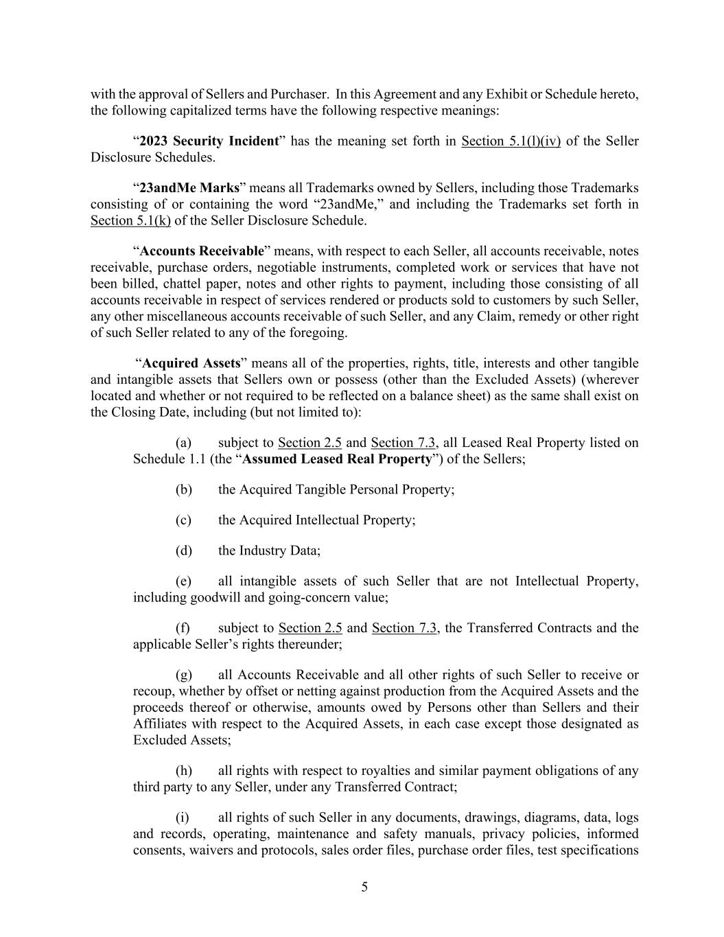 5 with the approval of Sellers and Purchaser. In this Agreement and any Exhibit or Schedule hereto, the following capitalized terms have the following respective meanings: “2023 Security Incident” has the meaning set forth in Section 5.1(l)(iv) of the Seller Disclosure Schedules. “23andMe Marks” means all Trademarks owned by Sellers, including those Trademarks consisting of or containing the word “23andMe,” and including the Trademarks set forth in Section 5.1(k) of the Seller Disclosure Schedule. “Accounts Receivable” means, with respect to each Seller, all accounts receivable, notes receivable, purchase orders, negotiable instruments, completed work or services that have not been billed, chattel paper, notes and other rights to payment, including those consisting of all accounts receivable in respect of services rendered or products sold to customers by such Seller, any other miscellaneous accounts receivable of such Seller, and any Claim, remedy or other right of such Seller related to any of the foregoing. “Acquired Assets” means all of the properties, rights, title, interests and other tangible and intangible assets that Sellers own or possess (other than the Excluded Assets) (wherever located and whether or not required to be reflected on a balance sheet) as the same shall exist on the Closing Date, including (but not limited to): (a) subject to Section 2.5 and Section 7.3, all Leased Real Property listed on Schedule 1.1 (the “Assumed Leased Real Property”) of the Sellers; (b) the Acquired Tangible Personal Property; (c) the Acquired Intellectual Property; (d) the Industry Data; (e) all intangible assets of such Seller that are not Intellectual Property, including goodwill and going-concern value; (f) subject to Section 2.5 and Section 7.3, the Transferred Contracts and the applicable Seller’s rights thereunder; (g) all Accounts Receivable and all other rights of such Seller to receive or recoup, whether by offset or netting against production from the Acquired Assets and the proceeds thereof or otherwise, amounts owed by Persons other than Sellers and their Affiliates with respect to the Acquired Assets, in each case except those designated as Excluded Assets; (h) all rights with respect to royalties and similar payment obligations of any third party to any Seller, under any Transferred Contract; (i) all rights of such Seller in any documents, drawings, diagrams, data, logs and records, operating, maintenance and safety manuals, privacy policies, informed consents, waivers and protocols, sales order files, purchase order files, test specifications