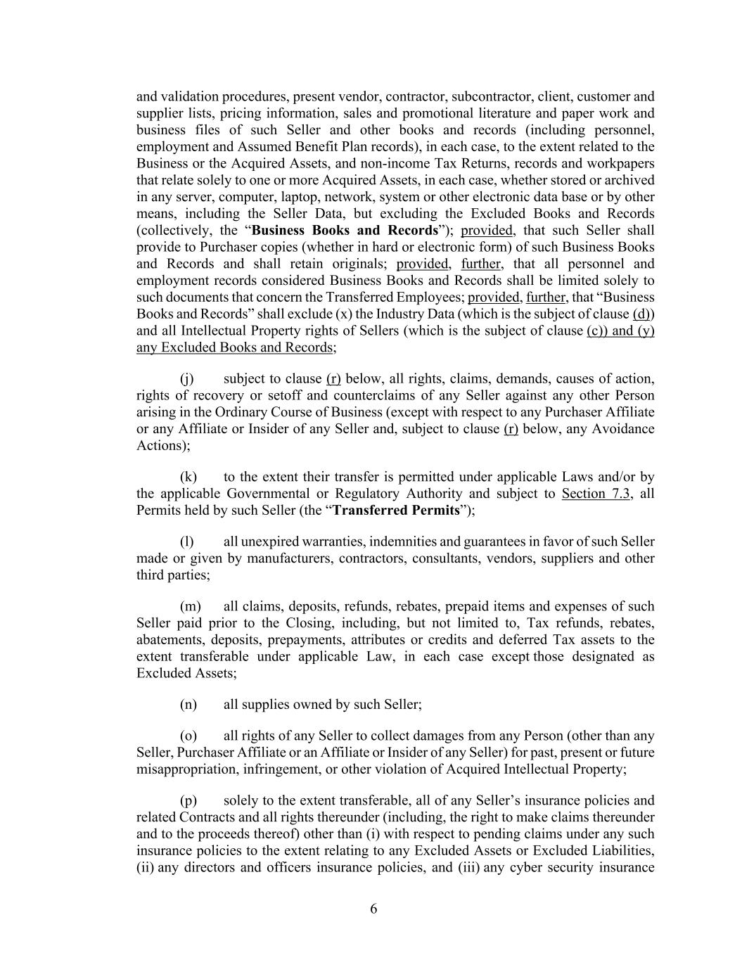 6 and validation procedures, present vendor, contractor, subcontractor, client, customer and supplier lists, pricing information, sales and promotional literature and paper work and business files of such Seller and other books and records (including personnel, employment and Assumed Benefit Plan records), in each case, to the extent related to the Business or the Acquired Assets, and non-income Tax Returns, records and workpapers that relate solely to one or more Acquired Assets, in each case, whether stored or archived in any server, computer, laptop, network, system or other electronic data base or by other means, including the Seller Data, but excluding the Excluded Books and Records (collectively, the “Business Books and Records”); provided, that such Seller shall provide to Purchaser copies (whether in hard or electronic form) of such Business Books and Records and shall retain originals; provided, further, that all personnel and employment records considered Business Books and Records shall be limited solely to such documents that concern the Transferred Employees; provided, further, that “Business Books and Records” shall exclude (x) the Industry Data (which is the subject of clause (d)) and all Intellectual Property rights of Sellers (which is the subject of clause (c)) and (y) any Excluded Books and Records; (j) subject to clause (r) below, all rights, claims, demands, causes of action, rights of recovery or setoff and counterclaims of any Seller against any other Person arising in the Ordinary Course of Business (except with respect to any Purchaser Affiliate or any Affiliate or Insider of any Seller and, subject to clause (r) below, any Avoidance Actions); (k) to the extent their transfer is permitted under applicable Laws and/or by the applicable Governmental or Regulatory Authority and subject to Section 7.3, all Permits held by such Seller (the “Transferred Permits”); (l) all unexpired warranties, indemnities and guarantees in favor of such Seller made or given by manufacturers, contractors, consultants, vendors, suppliers and other third parties; (m) all claims, deposits, refunds, rebates, prepaid items and expenses of such Seller paid prior to the Closing, including, but not limited to, Tax refunds, rebates, abatements, deposits, prepayments, attributes or credits and deferred Tax assets to the extent transferable under applicable Law, in each case except those designated as Excluded Assets; (n) all supplies owned by such Seller; (o) all rights of any Seller to collect damages from any Person (other than any Seller, Purchaser Affiliate or an Affiliate or Insider of any Seller) for past, present or future misappropriation, infringement, or other violation of Acquired Intellectual Property; (p) solely to the extent transferable, all of any Seller’s insurance policies and related Contracts and all rights thereunder (including, the right to make claims thereunder and to the proceeds thereof) other than (i) with respect to pending claims under any such insurance policies to the extent relating to any Excluded Assets or Excluded Liabilities, (ii) any directors and officers insurance policies, and (iii) any cyber security insurance