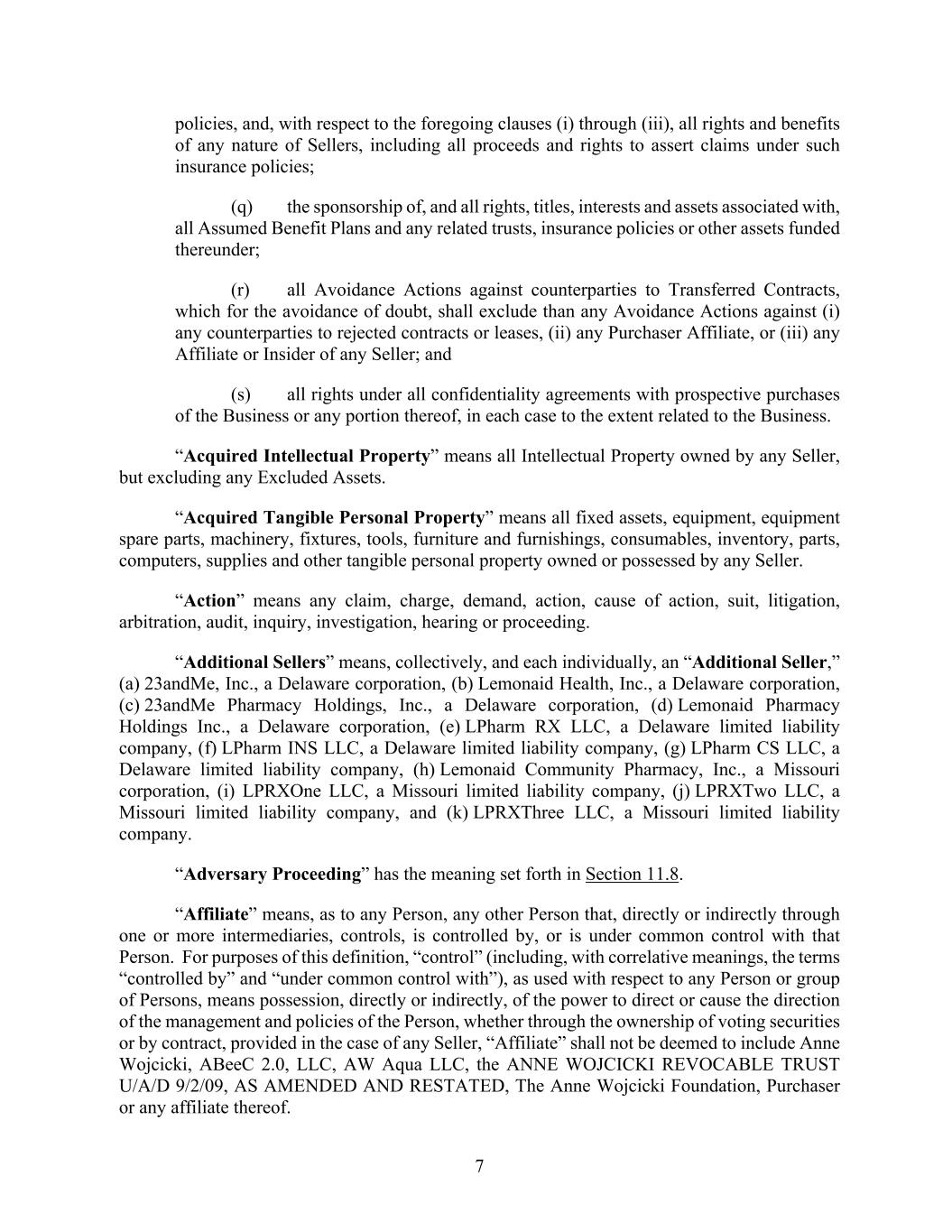 7 policies, and, with respect to the foregoing clauses (i) through (iii), all rights and benefits of any nature of Sellers, including all proceeds and rights to assert claims under such insurance policies; (q) the sponsorship of, and all rights, titles, interests and assets associated with, all Assumed Benefit Plans and any related trusts, insurance policies or other assets funded thereunder; (r) all Avoidance Actions against counterparties to Transferred Contracts, which for the avoidance of doubt, shall exclude than any Avoidance Actions against (i) any counterparties to rejected contracts or leases, (ii) any Purchaser Affiliate, or (iii) any Affiliate or Insider of any Seller; and (s) all rights under all confidentiality agreements with prospective purchases of the Business or any portion thereof, in each case to the extent related to the Business. “Acquired Intellectual Property” means all Intellectual Property owned by any Seller, but excluding any Excluded Assets. “Acquired Tangible Personal Property” means all fixed assets, equipment, equipment spare parts, machinery, fixtures, tools, furniture and furnishings, consumables, inventory, parts, computers, supplies and other tangible personal property owned or possessed by any Seller. “Action” means any claim, charge, demand, action, cause of action, suit, litigation, arbitration, audit, inquiry, investigation, hearing or proceeding. “Additional Sellers” means, collectively, and each individually, an “Additional Seller,” (a) 23andMe, Inc., a Delaware corporation, (b) Lemonaid Health, Inc., a Delaware corporation, (c) 23andMe Pharmacy Holdings, Inc., a Delaware corporation, (d) Lemonaid Pharmacy Holdings Inc., a Delaware corporation, (e) LPharm RX LLC, a Delaware limited liability company, (f) LPharm INS LLC, a Delaware limited liability company, (g) LPharm CS LLC, a Delaware limited liability company, (h) Lemonaid Community Pharmacy, Inc., a Missouri corporation, (i) LPRXOne LLC, a Missouri limited liability company, (j) LPRXTwo LLC, a Missouri limited liability company, and (k) LPRXThree LLC, a Missouri limited liability company. “Adversary Proceeding” has the meaning set forth in Section 11.8. “Affiliate” means, as to any Person, any other Person that, directly or indirectly through one or more intermediaries, controls, is controlled by, or is under common control with that Person. For purposes of this definition, “control” (including, with correlative meanings, the terms “controlled by” and “under common control with”), as used with respect to any Person or group of Persons, means possession, directly or indirectly, of the power to direct or cause the direction of the management and policies of the Person, whether through the ownership of voting securities or by contract, provided in the case of any Seller, “Affiliate” shall not be deemed to include Anne Wojcicki, ABeeC 2.0, LLC, AW Aqua LLC, the ANNE WOJCICKI REVOCABLE TRUST U/A/D 9/2/09, AS AMENDED AND RESTATED, The Anne Wojcicki Foundation, Purchaser or any affiliate thereof.