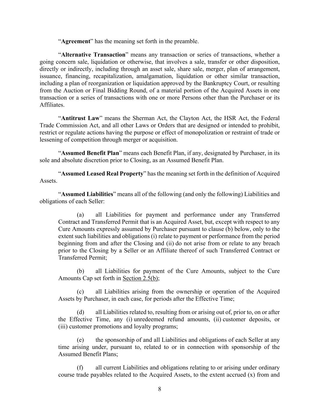 8 “Agreement” has the meaning set forth in the preamble. “Alternative Transaction” means any transaction or series of transactions, whether a going concern sale, liquidation or otherwise, that involves a sale, transfer or other disposition, directly or indirectly, including through an asset sale, share sale, merger, plan of arrangement, issuance, financing, recapitalization, amalgamation, liquidation or other similar transaction, including a plan of reorganization or liquidation approved by the Bankruptcy Court, or resulting from the Auction or Final Bidding Round, of a material portion of the Acquired Assets in one transaction or a series of transactions with one or more Persons other than the Purchaser or its Affiliates. “Antitrust Law” means the Sherman Act, the Clayton Act, the HSR Act, the Federal Trade Commission Act, and all other Laws or Orders that are designed or intended to prohibit, restrict or regulate actions having the purpose or effect of monopolization or restraint of trade or lessening of competition through merger or acquisition. “Assumed Benefit Plan” means each Benefit Plan, if any, designated by Purchaser, in its sole and absolute discretion prior to Closing, as an Assumed Benefit Plan. “Assumed Leased Real Property” has the meaning set forth in the definition of Acquired Assets. “Assumed Liabilities” means all of the following (and only the following) Liabilities and obligations of each Seller: (a) all Liabilities for payment and performance under any Transferred Contract and Transferred Permit that is an Acquired Asset, but, except with respect to any Cure Amounts expressly assumed by Purchaser pursuant to clause (b) below, only to the extent such liabilities and obligations (i) relate to payment or performance from the period beginning from and after the Closing and (ii) do not arise from or relate to any breach prior to the Closing by a Seller or an Affiliate thereof of such Transferred Contract or Transferred Permit; (b) all Liabilities for payment of the Cure Amounts, subject to the Cure Amounts Cap set forth in Section 2.5(b); (c) all Liabilities arising from the ownership or operation of the Acquired Assets by Purchaser, in each case, for periods after the Effective Time; (d) all Liabilities related to, resulting from or arising out of, prior to, on or after the Effective Time, any (i) unredeemed refund amounts, (ii) customer deposits, or (iii) customer promotions and loyalty programs; (e) the sponsorship of and all Liabilities and obligations of each Seller at any time arising under, pursuant to, related to or in connection with sponsorship of the Assumed Benefit Plans; (f) all current Liabilities and obligations relating to or arising under ordinary course trade payables related to the Acquired Assets, to the extent accrued (x) from and