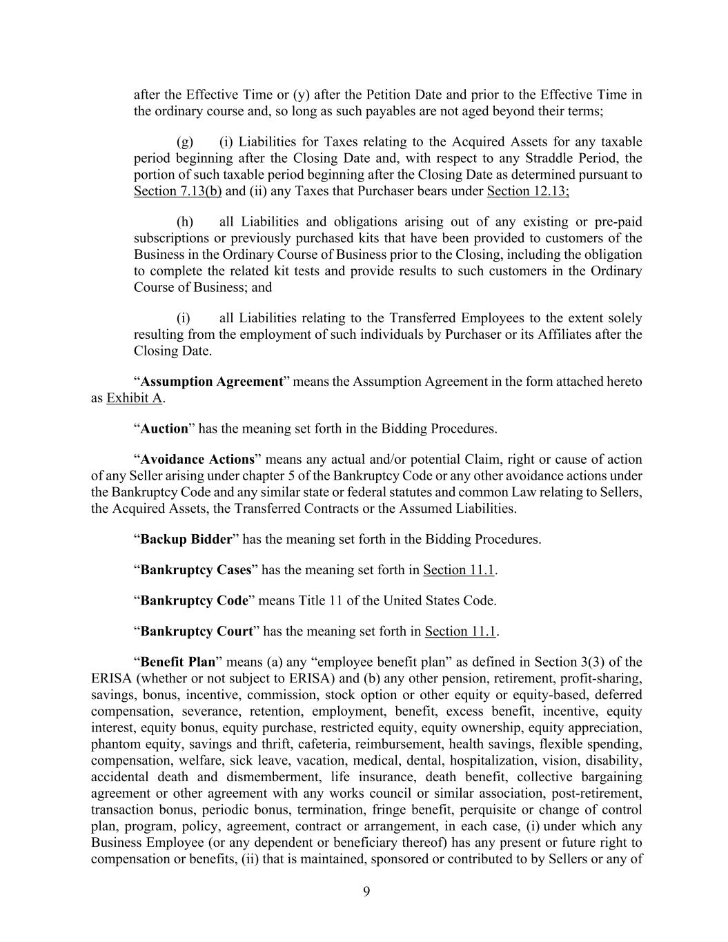 9 after the Effective Time or (y) after the Petition Date and prior to the Effective Time in the ordinary course and, so long as such payables are not aged beyond their terms; (g) (i) Liabilities for Taxes relating to the Acquired Assets for any taxable period beginning after the Closing Date and, with respect to any Straddle Period, the portion of such taxable period beginning after the Closing Date as determined pursuant to Section 7.13(b) and (ii) any Taxes that Purchaser bears under Section 12.13; (h) all Liabilities and obligations arising out of any existing or pre-paid subscriptions or previously purchased kits that have been provided to customers of the Business in the Ordinary Course of Business prior to the Closing, including the obligation to complete the related kit tests and provide results to such customers in the Ordinary Course of Business; and (i) all Liabilities relating to the Transferred Employees to the extent solely resulting from the employment of such individuals by Purchaser or its Affiliates after the Closing Date. “Assumption Agreement” means the Assumption Agreement in the form attached hereto as Exhibit A. “Auction” has the meaning set forth in the Bidding Procedures. “Avoidance Actions” means any actual and/or potential Claim, right or cause of action of any Seller arising under chapter 5 of the Bankruptcy Code or any other avoidance actions under the Bankruptcy Code and any similar state or federal statutes and common Law relating to Sellers, the Acquired Assets, the Transferred Contracts or the Assumed Liabilities. “Backup Bidder” has the meaning set forth in the Bidding Procedures. “Bankruptcy Cases” has the meaning set forth in Section 11.1. “Bankruptcy Code” means Title 11 of the United States Code. “Bankruptcy Court” has the meaning set forth in Section 11.1. “Benefit Plan” means (a) any “employee benefit plan” as defined in Section 3(3) of the ERISA (whether or not subject to ERISA) and (b) any other pension, retirement, profit-sharing, savings, bonus, incentive, commission, stock option or other equity or equity-based, deferred compensation, severance, retention, employment, benefit, excess benefit, incentive, equity interest, equity bonus, equity purchase, restricted equity, equity ownership, equity appreciation, phantom equity, savings and thrift, cafeteria, reimbursement, health savings, flexible spending, compensation, welfare, sick leave, vacation, medical, dental, hospitalization, vision, disability, accidental death and dismemberment, life insurance, death benefit, collective bargaining agreement or other agreement with any works council or similar association, post-retirement, transaction bonus, periodic bonus, termination, fringe benefit, perquisite or change of control plan, program, policy, agreement, contract or arrangement, in each case, (i) under which any Business Employee (or any dependent or beneficiary thereof) has any present or future right to compensation or benefits, (ii) that is maintained, sponsored or contributed to by Sellers or any of