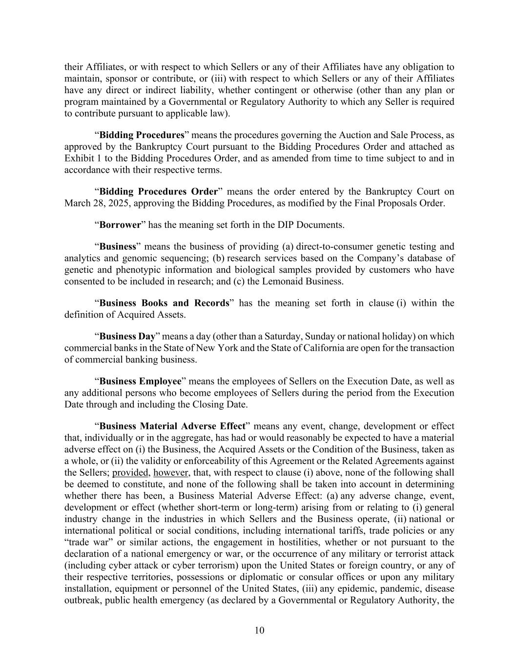 10 their Affiliates, or with respect to which Sellers or any of their Affiliates have any obligation to maintain, sponsor or contribute, or (iii) with respect to which Sellers or any of their Affiliates have any direct or indirect liability, whether contingent or otherwise (other than any plan or program maintained by a Governmental or Regulatory Authority to which any Seller is required to contribute pursuant to applicable law). “Bidding Procedures” means the procedures governing the Auction and Sale Process, as approved by the Bankruptcy Court pursuant to the Bidding Procedures Order and attached as Exhibit 1 to the Bidding Procedures Order, and as amended from time to time subject to and in accordance with their respective terms. “Bidding Procedures Order” means the order entered by the Bankruptcy Court on March 28, 2025, approving the Bidding Procedures, as modified by the Final Proposals Order. “Borrower” has the meaning set forth in the DIP Documents. “Business” means the business of providing (a) direct-to-consumer genetic testing and analytics and genomic sequencing; (b) research services based on the Company’s database of genetic and phenotypic information and biological samples provided by customers who have consented to be included in research; and (c) the Lemonaid Business. “Business Books and Records” has the meaning set forth in clause (i) within the definition of Acquired Assets. “Business Day” means a day (other than a Saturday, Sunday or national holiday) on which commercial banks in the State of New York and the State of California are open for the transaction of commercial banking business. “Business Employee” means the employees of Sellers on the Execution Date, as well as any additional persons who become employees of Sellers during the period from the Execution Date through and including the Closing Date. “Business Material Adverse Effect” means any event, change, development or effect that, individually or in the aggregate, has had or would reasonably be expected to have a material adverse effect on (i) the Business, the Acquired Assets or the Condition of the Business, taken as a whole, or (ii) the validity or enforceability of this Agreement or the Related Agreements against the Sellers; provided, however, that, with respect to clause (i) above, none of the following shall be deemed to constitute, and none of the following shall be taken into account in determining whether there has been, a Business Material Adverse Effect: (a) any adverse change, event, development or effect (whether short-term or long-term) arising from or relating to (i) general industry change in the industries in which Sellers and the Business operate, (ii) national or international political or social conditions, including international tariffs, trade policies or any “trade war” or similar actions, the engagement in hostilities, whether or not pursuant to the declaration of a national emergency or war, or the occurrence of any military or terrorist attack (including cyber attack or cyber terrorism) upon the United States or foreign country, or any of their respective territories, possessions or diplomatic or consular offices or upon any military installation, equipment or personnel of the United States, (iii) any epidemic, pandemic, disease outbreak, public health emergency (as declared by a Governmental or Regulatory Authority, the
