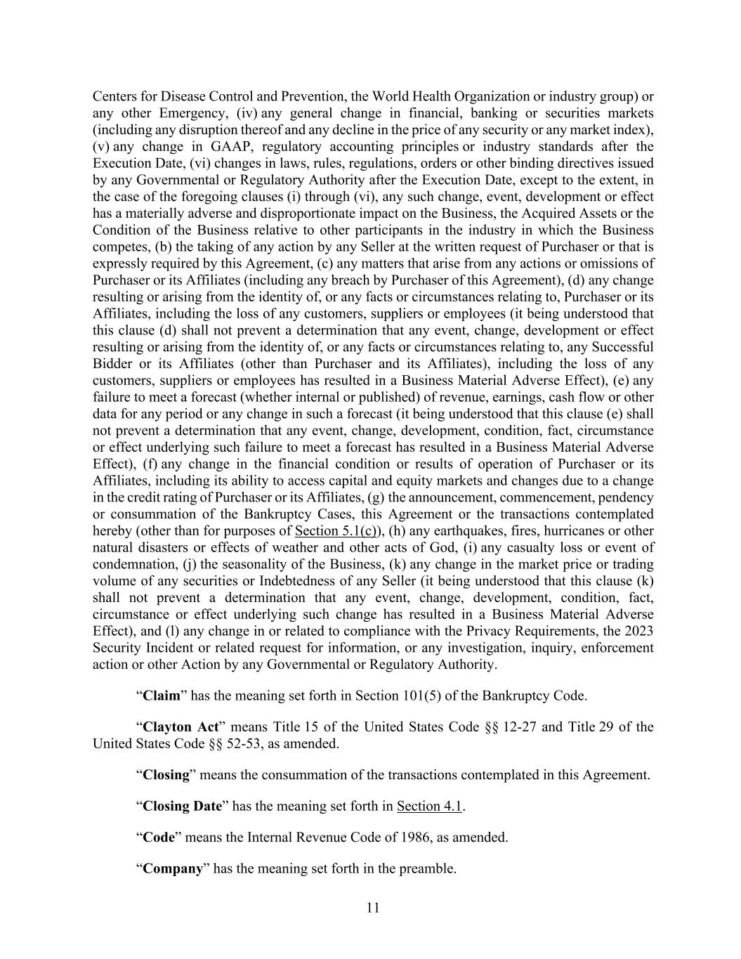 11 Centers for Disease Control and Prevention, the World Health Organization or industry group) or any other Emergency, (iv) any general change in financial, banking or securities markets (including any disruption thereof and any decline in the price of any security or any market index), (v) any change in GAAP, regulatory accounting principles or industry standards after the Execution Date, (vi) changes in laws, rules, regulations, orders or other binding directives issued by any Governmental or Regulatory Authority after the Execution Date, except to the extent, in the case of the foregoing clauses (i) through (vi), any such change, event, development or effect has a materially adverse and disproportionate impact on the Business, the Acquired Assets or the Condition of the Business relative to other participants in the industry in which the Business competes, (b) the taking of any action by any Seller at the written request of Purchaser or that is expressly required by this Agreement, (c) any matters that arise from any actions or omissions of Purchaser or its Affiliates (including any breach by Purchaser of this Agreement), (d) any change resulting or arising from the identity of, or any facts or circumstances relating to, Purchaser or its Affiliates, including the loss of any customers, suppliers or employees (it being understood that this clause (d) shall not prevent a determination that any event, change, development or effect resulting or arising from the identity of, or any facts or circumstances relating to, any Successful Bidder or its Affiliates (other than Purchaser and its Affiliates), including the loss of any customers, suppliers or employees has resulted in a Business Material Adverse Effect), (e) any failure to meet a forecast (whether internal or published) of revenue, earnings, cash flow or other data for any period or any change in such a forecast (it being understood that this clause (e) shall not prevent a determination that any event, change, development, condition, fact, circumstance or effect underlying such failure to meet a forecast has resulted in a Business Material Adverse Effect), (f) any change in the financial condition or results of operation of Purchaser or its Affiliates, including its ability to access capital and equity markets and changes due to a change in the credit rating of Purchaser or its Affiliates, (g) the announcement, commencement, pendency or consummation of the Bankruptcy Cases, this Agreement or the transactions contemplated hereby (other than for purposes of Section 5.1(c)), (h) any earthquakes, fires, hurricanes or other natural disasters or effects of weather and other acts of God, (i) any casualty loss or event of condemnation, (j) the seasonality of the Business, (k) any change in the market price or trading volume of any securities or Indebtedness of any Seller (it being understood that this clause (k) shall not prevent a determination that any event, change, development, condition, fact, circumstance or effect underlying such change has resulted in a Business Material Adverse Effect), and (l) any change in or related to compliance with the Privacy Requirements, the 2023 Security Incident or related request for information, or any investigation, inquiry, enforcement action or other Action by any Governmental or Regulatory Authority. “Claim” has the meaning set forth in Section 101(5) of the Bankruptcy Code. “Clayton Act” means Title 15 of the United States Code §§ 12-27 and Title 29 of the United States Code §§ 52-53, as amended. “Closing” means the consummation of the transactions contemplated in this Agreement. “Closing Date” has the meaning set forth in Section 4.1. “Code” means the Internal Revenue Code of 1986, as amended. “Company” has the meaning set forth in the preamble.
