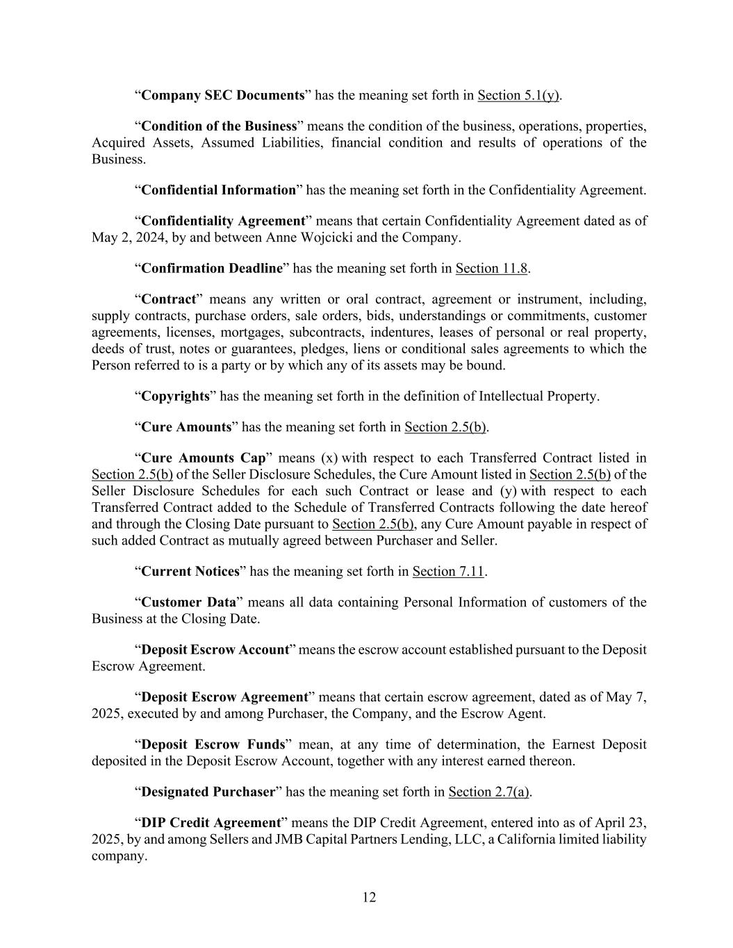 12 “Company SEC Documents” has the meaning set forth in Section 5.1(y). “Condition of the Business” means the condition of the business, operations, properties, Acquired Assets, Assumed Liabilities, financial condition and results of operations of the Business. “Confidential Information” has the meaning set forth in the Confidentiality Agreement. “Confidentiality Agreement” means that certain Confidentiality Agreement dated as of May 2, 2024, by and between Anne Wojcicki and the Company. “Confirmation Deadline” has the meaning set forth in Section 11.8. “Contract” means any written or oral contract, agreement or instrument, including, supply contracts, purchase orders, sale orders, bids, understandings or commitments, customer agreements, licenses, mortgages, subcontracts, indentures, leases of personal or real property, deeds of trust, notes or guarantees, pledges, liens or conditional sales agreements to which the Person referred to is a party or by which any of its assets may be bound. “Copyrights” has the meaning set forth in the definition of Intellectual Property. “Cure Amounts” has the meaning set forth in Section 2.5(b). “Cure Amounts Cap” means (x) with respect to each Transferred Contract listed in Section 2.5(b) of the Seller Disclosure Schedules, the Cure Amount listed in Section 2.5(b) of the Seller Disclosure Schedules for each such Contract or lease and (y) with respect to each Transferred Contract added to the Schedule of Transferred Contracts following the date hereof and through the Closing Date pursuant to Section 2.5(b), any Cure Amount payable in respect of such added Contract as mutually agreed between Purchaser and Seller. “Current Notices” has the meaning set forth in Section 7.11. “Customer Data” means all data containing Personal Information of customers of the Business at the Closing Date. “Deposit Escrow Account” means the escrow account established pursuant to the Deposit Escrow Agreement. “Deposit Escrow Agreement” means that certain escrow agreement, dated as of May 7, 2025, executed by and among Purchaser, the Company, and the Escrow Agent. “Deposit Escrow Funds” mean, at any time of determination, the Earnest Deposit deposited in the Deposit Escrow Account, together with any interest earned thereon. “Designated Purchaser” has the meaning set forth in Section 2.7(a). “DIP Credit Agreement” means the DIP Credit Agreement, entered into as of April 23, 2025, by and among Sellers and JMB Capital Partners Lending, LLC, a California limited liability company.