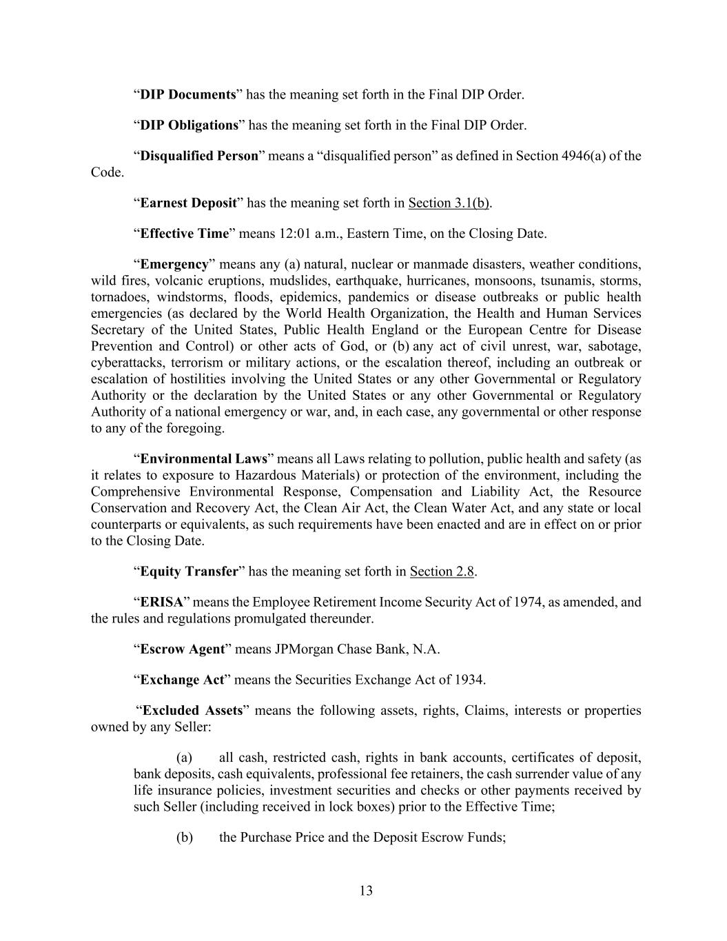 13 “DIP Documents” has the meaning set forth in the Final DIP Order. “DIP Obligations” has the meaning set forth in the Final DIP Order. “Disqualified Person” means a “disqualified person” as defined in Section 4946(a) of the Code. “Earnest Deposit” has the meaning set forth in Section 3.1(b). “Effective Time” means 12:01 a.m., Eastern Time, on the Closing Date. “Emergency” means any (a) natural, nuclear or manmade disasters, weather conditions, wild fires, volcanic eruptions, mudslides, earthquake, hurricanes, monsoons, tsunamis, storms, tornadoes, windstorms, floods, epidemics, pandemics or disease outbreaks or public health emergencies (as declared by the World Health Organization, the Health and Human Services Secretary of the United States, Public Health England or the European Centre for Disease Prevention and Control) or other acts of God, or (b) any act of civil unrest, war, sabotage, cyberattacks, terrorism or military actions, or the escalation thereof, including an outbreak or escalation of hostilities involving the United States or any other Governmental or Regulatory Authority or the declaration by the United States or any other Governmental or Regulatory Authority of a national emergency or war, and, in each case, any governmental or other response to any of the foregoing. “Environmental Laws” means all Laws relating to pollution, public health and safety (as it relates to exposure to Hazardous Materials) or protection of the environment, including the Comprehensive Environmental Response, Compensation and Liability Act, the Resource Conservation and Recovery Act, the Clean Air Act, the Clean Water Act, and any state or local counterparts or equivalents, as such requirements have been enacted and are in effect on or prior to the Closing Date. “Equity Transfer” has the meaning set forth in Section 2.8. “ERISA” means the Employee Retirement Income Security Act of 1974, as amended, and the rules and regulations promulgated thereunder. “Escrow Agent” means JPMorgan Chase Bank, N.A. “Exchange Act” means the Securities Exchange Act of 1934. “Excluded Assets” means the following assets, rights, Claims, interests or properties owned by any Seller: (a) all cash, restricted cash, rights in bank accounts, certificates of deposit, bank deposits, cash equivalents, professional fee retainers, the cash surrender value of any life insurance policies, investment securities and checks or other payments received by such Seller (including received in lock boxes) prior to the Effective Time; (b) the Purchase Price and the Deposit Escrow Funds;