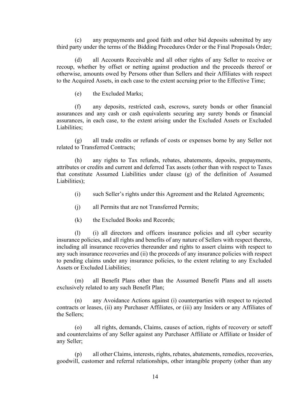 14 (c) any prepayments and good faith and other bid deposits submitted by any third party under the terms of the Bidding Procedures Order or the Final Proposals Order; (d) all Accounts Receivable and all other rights of any Seller to receive or recoup, whether by offset or netting against production and the proceeds thereof or otherwise, amounts owed by Persons other than Sellers and their Affiliates with respect to the Acquired Assets, in each case to the extent accruing prior to the Effective Time; (e) the Excluded Marks; (f) any deposits, restricted cash, escrows, surety bonds or other financial assurances and any cash or cash equivalents securing any surety bonds or financial assurances, in each case, to the extent arising under the Excluded Assets or Excluded Liabilities; (g) all trade credits or refunds of costs or expenses borne by any Seller not related to Transferred Contracts; (h) any rights to Tax refunds, rebates, abatements, deposits, prepayments, attributes or credits and current and deferred Tax assets (other than with respect to Taxes that constitute Assumed Liabilities under clause (g) of the definition of Assumed Liabilities); (i) such Seller’s rights under this Agreement and the Related Agreements; (j) all Permits that are not Transferred Permits; (k) the Excluded Books and Records; (l) (i) all directors and officers insurance policies and all cyber security insurance policies, and all rights and benefits of any nature of Sellers with respect thereto, including all insurance recoveries thereunder and rights to assert claims with respect to any such insurance recoveries and (ii) the proceeds of any insurance policies with respect to pending claims under any insurance policies, to the extent relating to any Excluded Assets or Excluded Liabilities; (m) all Benefit Plans other than the Assumed Benefit Plans and all assets exclusively related to any such Benefit Plan; (n) any Avoidance Actions against (i) counterparties with respect to rejected contracts or leases, (ii) any Purchaser Affiliates, or (iii) any Insiders or any Affiliates of the Sellers; (o) all rights, demands, Claims, causes of action, rights of recovery or setoff and counterclaims of any Seller against any Purchaser Affiliate or Affiliate or Insider of any Seller; (p) all other Claims, interests, rights, rebates, abatements, remedies, recoveries, goodwill, customer and referral relationships, other intangible property (other than any