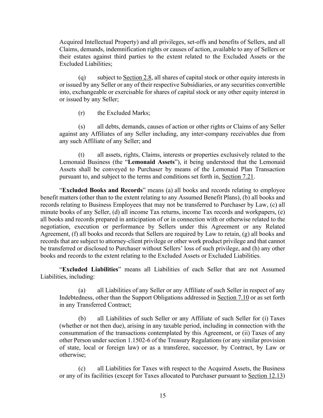 15 Acquired Intellectual Property) and all privileges, set-offs and benefits of Sellers, and all Claims, demands, indemnification rights or causes of action, available to any of Sellers or their estates against third parties to the extent related to the Excluded Assets or the Excluded Liabilities; (q) subject to Section 2.8, all shares of capital stock or other equity interests in or issued by any Seller or any of their respective Subsidiaries, or any securities convertible into, exchangeable or exercisable for shares of capital stock or any other equity interest in or issued by any Seller; (r) the Excluded Marks; (s) all debts, demands, causes of action or other rights or Claims of any Seller against any Affiliates of any Seller including, any inter-company receivables due from any such Affiliate of any Seller; and (t) all assets, rights, Claims, interests or properties exclusively related to the Lemonaid Business (the “Lemonaid Assets”), it being understood that the Lemonaid Assets shall be conveyed to Purchaser by means of the Lemonaid Plan Transaction pursuant to, and subject to the terms and conditions set forth in, Section 7.21. “Excluded Books and Records” means (a) all books and records relating to employee benefit matters (other than to the extent relating to any Assumed Benefit Plans), (b) all books and records relating to Business Employees that may not be transferred to Purchaser by Law, (c) all minute books of any Seller, (d) all income Tax returns, income Tax records and workpapers, (e) all books and records prepared in anticipation of or in connection with or otherwise related to the negotiation, execution or performance by Sellers under this Agreement or any Related Agreement, (f) all books and records that Sellers are required by Law to retain, (g) all books and records that are subject to attorney-client privilege or other work product privilege and that cannot be transferred or disclosed to Purchaser without Sellers’ loss of such privilege, and (h) any other books and records to the extent relating to the Excluded Assets or Excluded Liabilities. “Excluded Liabilities” means all Liabilities of each Seller that are not Assumed Liabilities, including: (a) all Liabilities of any Seller or any Affiliate of such Seller in respect of any Indebtedness, other than the Support Obligations addressed in Section 7.10 or as set forth in any Transferred Contract; (b) all Liabilities of such Seller or any Affiliate of such Seller for (i) Taxes (whether or not then due), arising in any taxable period, including in connection with the consummation of the transactions contemplated by this Agreement, or (ii) Taxes of any other Person under section 1.1502-6 of the Treasury Regulations (or any similar provision of state, local or foreign law) or as a transferee, successor, by Contract, by Law or otherwise; (c) all Liabilities for Taxes with respect to the Acquired Assets, the Business or any of its facilities (except for Taxes allocated to Purchaser pursuant to Section 12.13)