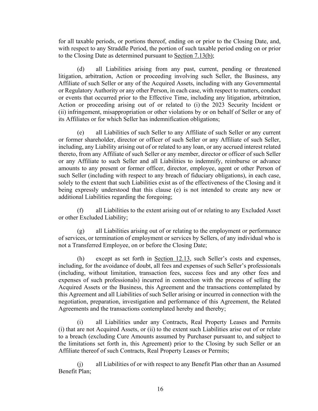 16 for all taxable periods, or portions thereof, ending on or prior to the Closing Date, and, with respect to any Straddle Period, the portion of such taxable period ending on or prior to the Closing Date as determined pursuant to Section 7.13(b); (d) all Liabilities arising from any past, current, pending or threatened litigation, arbitration, Action or proceeding involving such Seller, the Business, any Affiliate of such Seller or any of the Acquired Assets, including with any Governmental or Regulatory Authority or any other Person, in each case, with respect to matters, conduct or events that occurred prior to the Effective Time, including any litigation, arbitration, Action or proceeding arising out of or related to (i) the 2023 Security Incident or (ii) infringement, misappropriation or other violations by or on behalf of Seller or any of its Affiliates or for which Seller has indemnification obligations; (e) all Liabilities of such Seller to any Affiliate of such Seller or any current or former shareholder, director or officer of such Seller or any Affiliate of such Seller, including, any Liability arising out of or related to any loan, or any accrued interest related thereto, from any Affiliate of such Seller or any member, director or officer of such Seller or any Affiliate to such Seller and all Liabilities to indemnify, reimburse or advance amounts to any present or former officer, director, employee, agent or other Person of such Seller (including with respect to any breach of fiduciary obligations), in each case, solely to the extent that such Liabilities exist as of the effectiveness of the Closing and it being expressly understood that this clause (e) is not intended to create any new or additional Liabilities regarding the foregoing; (f) all Liabilities to the extent arising out of or relating to any Excluded Asset or other Excluded Liability; (g) all Liabilities arising out of or relating to the employment or performance of services, or termination of employment or services by Sellers, of any individual who is not a Transferred Employee, on or before the Closing Date; (h) except as set forth in Section 12.13, such Seller’s costs and expenses, including, for the avoidance of doubt, all fees and expenses of such Seller’s professionals (including, without limitation, transaction fees, success fees and any other fees and expenses of such professionals) incurred in connection with the process of selling the Acquired Assets or the Business, this Agreement and the transactions contemplated by this Agreement and all Liabilities of such Seller arising or incurred in connection with the negotiation, preparation, investigation and performance of this Agreement, the Related Agreements and the transactions contemplated hereby and thereby; (i) all Liabilities under any Contracts, Real Property Leases and Permits (i) that are not Acquired Assets, or (ii) to the extent such Liabilities arise out of or relate to a breach (excluding Cure Amounts assumed by Purchaser pursuant to, and subject to the limitations set forth in, this Agreement) prior to the Closing by such Seller or an Affiliate thereof of such Contracts, Real Property Leases or Permits; (j) all Liabilities of or with respect to any Benefit Plan other than an Assumed Benefit Plan;