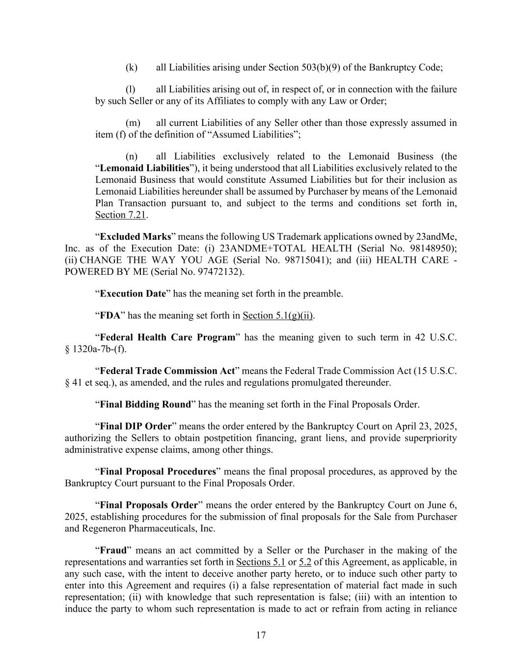 17 (k) all Liabilities arising under Section 503(b)(9) of the Bankruptcy Code; (l) all Liabilities arising out of, in respect of, or in connection with the failure by such Seller or any of its Affiliates to comply with any Law or Order; (m) all current Liabilities of any Seller other than those expressly assumed in item (f) of the definition of “Assumed Liabilities”; (n) all Liabilities exclusively related to the Lemonaid Business (the “Lemonaid Liabilities”), it being understood that all Liabilities exclusively related to the Lemonaid Business that would constitute Assumed Liabilities but for their inclusion as Lemonaid Liabilities hereunder shall be assumed by Purchaser by means of the Lemonaid Plan Transaction pursuant to, and subject to the terms and conditions set forth in, Section 7.21. “Excluded Marks” means the following US Trademark applications owned by 23andMe, Inc. as of the Execution Date: (i) 23ANDME+TOTAL HEALTH (Serial No. 98148950); (ii) CHANGE THE WAY YOU AGE (Serial No. 98715041); and (iii) HEALTH CARE - POWERED BY ME (Serial No. 97472132). “Execution Date” has the meaning set forth in the preamble. “FDA” has the meaning set forth in Section 5.1(g)(ii). “Federal Health Care Program” has the meaning given to such term in 42 U.S.C. § 1320a-7b-(f). “Federal Trade Commission Act” means the Federal Trade Commission Act (15 U.S.C. § 41 et seq.), as amended, and the rules and regulations promulgated thereunder. “Final Bidding Round” has the meaning set forth in the Final Proposals Order. “Final DIP Order” means the order entered by the Bankruptcy Court on April 23, 2025, authorizing the Sellers to obtain postpetition financing, grant liens, and provide superpriority administrative expense claims, among other things. “Final Proposal Procedures” means the final proposal procedures, as approved by the Bankruptcy Court pursuant to the Final Proposals Order. “Final Proposals Order” means the order entered by the Bankruptcy Court on June 6, 2025, establishing procedures for the submission of final proposals for the Sale from Purchaser and Regeneron Pharmaceuticals, Inc. “Fraud” means an act committed by a Seller or the Purchaser in the making of the representations and warranties set forth in Sections 5.1 or 5.2 of this Agreement, as applicable, in any such case, with the intent to deceive another party hereto, or to induce such other party to enter into this Agreement and requires (i) a false representation of material fact made in such representation; (ii) with knowledge that such representation is false; (iii) with an intention to induce the party to whom such representation is made to act or refrain from acting in reliance