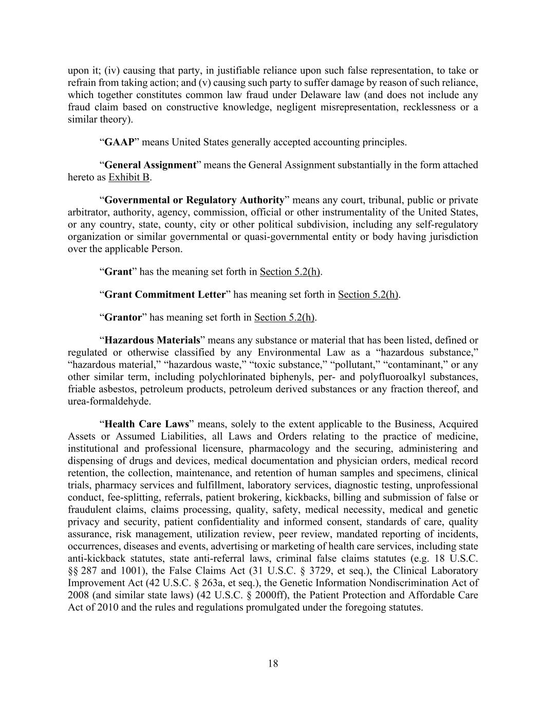 18 upon it; (iv) causing that party, in justifiable reliance upon such false representation, to take or refrain from taking action; and (v) causing such party to suffer damage by reason of such reliance, which together constitutes common law fraud under Delaware law (and does not include any fraud claim based on constructive knowledge, negligent misrepresentation, recklessness or a similar theory). “GAAP” means United States generally accepted accounting principles. “General Assignment” means the General Assignment substantially in the form attached hereto as Exhibit B. “Governmental or Regulatory Authority” means any court, tribunal, public or private arbitrator, authority, agency, commission, official or other instrumentality of the United States, or any country, state, county, city or other political subdivision, including any self-regulatory organization or similar governmental or quasi-governmental entity or body having jurisdiction over the applicable Person. “Grant” has the meaning set forth in Section 5.2(h). “Grant Commitment Letter” has meaning set forth in Section 5.2(h). “Grantor” has meaning set forth in Section 5.2(h). “Hazardous Materials” means any substance or material that has been listed, defined or regulated or otherwise classified by any Environmental Law as a “hazardous substance,” “hazardous material,” “hazardous waste,” “toxic substance,” “pollutant,” “contaminant,” or any other similar term, including polychlorinated biphenyls, per- and polyfluoroalkyl substances, friable asbestos, petroleum products, petroleum derived substances or any fraction thereof, and urea-formaldehyde. “Health Care Laws” means, solely to the extent applicable to the Business, Acquired Assets or Assumed Liabilities, all Laws and Orders relating to the practice of medicine, institutional and professional licensure, pharmacology and the securing, administering and dispensing of drugs and devices, medical documentation and physician orders, medical record retention, the collection, maintenance, and retention of human samples and specimens, clinical trials, pharmacy services and fulfillment, laboratory services, diagnostic testing, unprofessional conduct, fee-splitting, referrals, patient brokering, kickbacks, billing and submission of false or fraudulent claims, claims processing, quality, safety, medical necessity, medical and genetic privacy and security, patient confidentiality and informed consent, standards of care, quality assurance, risk management, utilization review, peer review, mandated reporting of incidents, occurrences, diseases and events, advertising or marketing of health care services, including state anti-kickback statutes, state anti-referral laws, criminal false claims statutes (e.g. 18 U.S.C. §§ 287 and 1001), the False Claims Act (31 U.S.C. § 3729, et seq.), the Clinical Laboratory Improvement Act (42 U.S.C. § 263a, et seq.), the Genetic Information Nondiscrimination Act of 2008 (and similar state laws) (42 U.S.C. § 2000ff), the Patient Protection and Affordable Care Act of 2010 and the rules and regulations promulgated under the foregoing statutes.