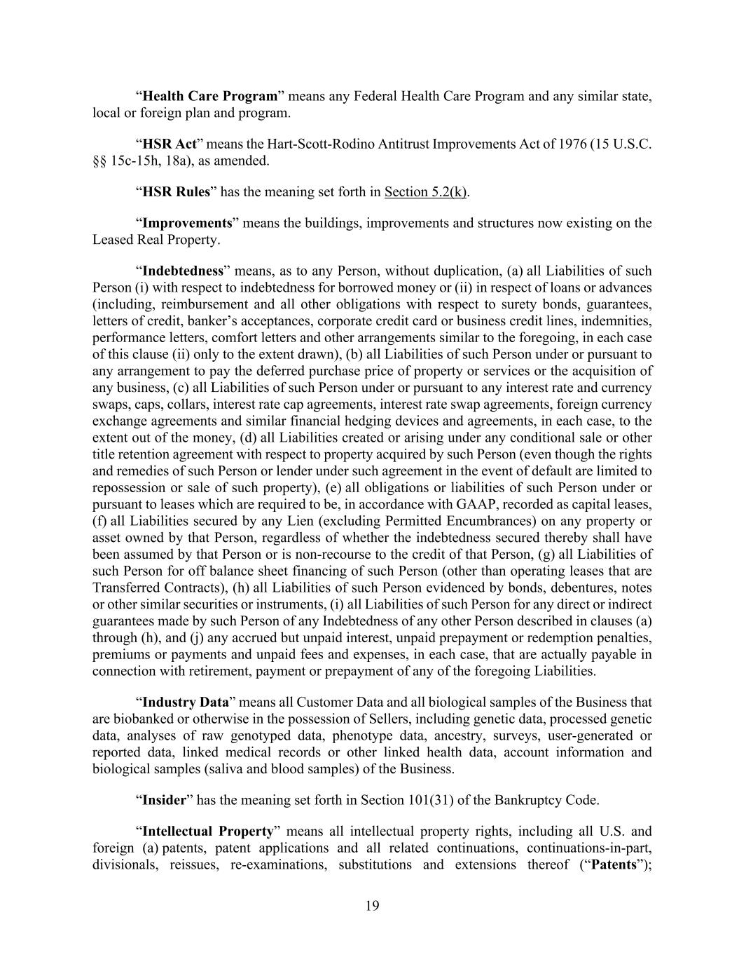 19 “Health Care Program” means any Federal Health Care Program and any similar state, local or foreign plan and program. “HSR Act” means the Hart-Scott-Rodino Antitrust Improvements Act of 1976 (15 U.S.C. §§ 15c-15h, 18a), as amended. “HSR Rules” has the meaning set forth in Section 5.2(k). “Improvements” means the buildings, improvements and structures now existing on the Leased Real Property. “Indebtedness” means, as to any Person, without duplication, (a) all Liabilities of such Person (i) with respect to indebtedness for borrowed money or (ii) in respect of loans or advances (including, reimbursement and all other obligations with respect to surety bonds, guarantees, letters of credit, banker’s acceptances, corporate credit card or business credit lines, indemnities, performance letters, comfort letters and other arrangements similar to the foregoing, in each case of this clause (ii) only to the extent drawn), (b) all Liabilities of such Person under or pursuant to any arrangement to pay the deferred purchase price of property or services or the acquisition of any business, (c) all Liabilities of such Person under or pursuant to any interest rate and currency swaps, caps, collars, interest rate cap agreements, interest rate swap agreements, foreign currency exchange agreements and similar financial hedging devices and agreements, in each case, to the extent out of the money, (d) all Liabilities created or arising under any conditional sale or other title retention agreement with respect to property acquired by such Person (even though the rights and remedies of such Person or lender under such agreement in the event of default are limited to repossession or sale of such property), (e) all obligations or liabilities of such Person under or pursuant to leases which are required to be, in accordance with GAAP, recorded as capital leases, (f) all Liabilities secured by any Lien (excluding Permitted Encumbrances) on any property or asset owned by that Person, regardless of whether the indebtedness secured thereby shall have been assumed by that Person or is non-recourse to the credit of that Person, (g) all Liabilities of such Person for off balance sheet financing of such Person (other than operating leases that are Transferred Contracts), (h) all Liabilities of such Person evidenced by bonds, debentures, notes or other similar securities or instruments, (i) all Liabilities of such Person for any direct or indirect guarantees made by such Person of any Indebtedness of any other Person described in clauses (a) through (h), and (j) any accrued but unpaid interest, unpaid prepayment or redemption penalties, premiums or payments and unpaid fees and expenses, in each case, that are actually payable in connection with retirement, payment or prepayment of any of the foregoing Liabilities. “Industry Data” means all Customer Data and all biological samples of the Business that are biobanked or otherwise in the possession of Sellers, including genetic data, processed genetic data, analyses of raw genotyped data, phenotype data, ancestry, surveys, user-generated or reported data, linked medical records or other linked health data, account information and biological samples (saliva and blood samples) of the Business. “Insider” has the meaning set forth in Section 101(31) of the Bankruptcy Code. “Intellectual Property” means all intellectual property rights, including all U.S. and foreign (a) patents, patent applications and all related continuations, continuations-in-part, divisionals, reissues, re-examinations, substitutions and extensions thereof (“Patents”);