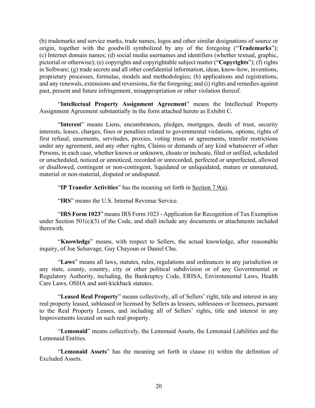 20 (b) trademarks and service marks, trade names, logos and other similar designations of source or origin, together with the goodwill symbolized by any of the foregoing (“Trademarks”); (c) Internet domain names; (d) social media usernames and identifiers (whether textual, graphic, pictorial or otherwise); (e) copyrights and copyrightable subject matter (“Copyrights”); (f) rights in Software; (g) trade secrets and all other confidential information, ideas, know-how, inventions, proprietary processes, formulae, models and methodologies; (h) applications and registrations, and any renewals, extensions and reversions, for the foregoing; and (i) rights and remedies against past, present and future infringement, misappropriation or other violation thereof. “Intellectual Property Assignment Agreement” means the Intellectual Property Assignment Agreement substantially in the form attached hereto as Exhibit C. “Interest” means Liens, encumbrances, pledges, mortgages, deeds of trust, security interests, leases, charges, fines or penalties related to governmental violations, options, rights of first refusal, easements, servitudes, proxies, voting trusts or agreements, transfer restrictions under any agreement, and any other rights, Claims or demands of any kind whatsoever of other Persons, in each case, whether known or unknown, choate or inchoate, filed or unfiled, scheduled or unscheduled, noticed or unnoticed, recorded or unrecorded, perfected or unperfected, allowed or disallowed, contingent or non-contingent, liquidated or unliquidated, mature or unmatured, material or non-material, disputed or undisputed. “IP Transfer Activities” has the meaning set forth in Section 7.9(a). “IRS” means the U.S. Internal Revenue Service. “IRS Form 1023” means IRS Form 1023 - Application for Recognition of Tax Exemption under Section 501(c)(3) of the Code, and shall include any documents or attachments included therewith. “Knowledge” means, with respect to Sellers, the actual knowledge, after reasonable inquiry, of Joe Selsavage, Guy Chayoun or Daniel Chu. “Laws” means all laws, statutes, rules, regulations and ordinances in any jurisdiction or any state, county, country, city or other political subdivision or of any Governmental or Regulatory Authority, including, the Bankruptcy Code, ERISA, Environmental Laws, Health Care Laws, OSHA and anti-kickback statutes. “Leased Real Property” means collectively, all of Sellers’ right, title and interest in any real property leased, subleased or licensed by Sellers as lessees, sublessees or licensees, pursuant to the Real Property Leases, and including all of Sellers’ rights, title and interest in any Improvements located on such real property. “Lemonaid” means collectively, the Lemonaid Assets, the Lemonaid Liabilities and the Lemonaid Entities. “Lemonaid Assets” has the meaning set forth in clause (t) within the definition of Excluded Assets.