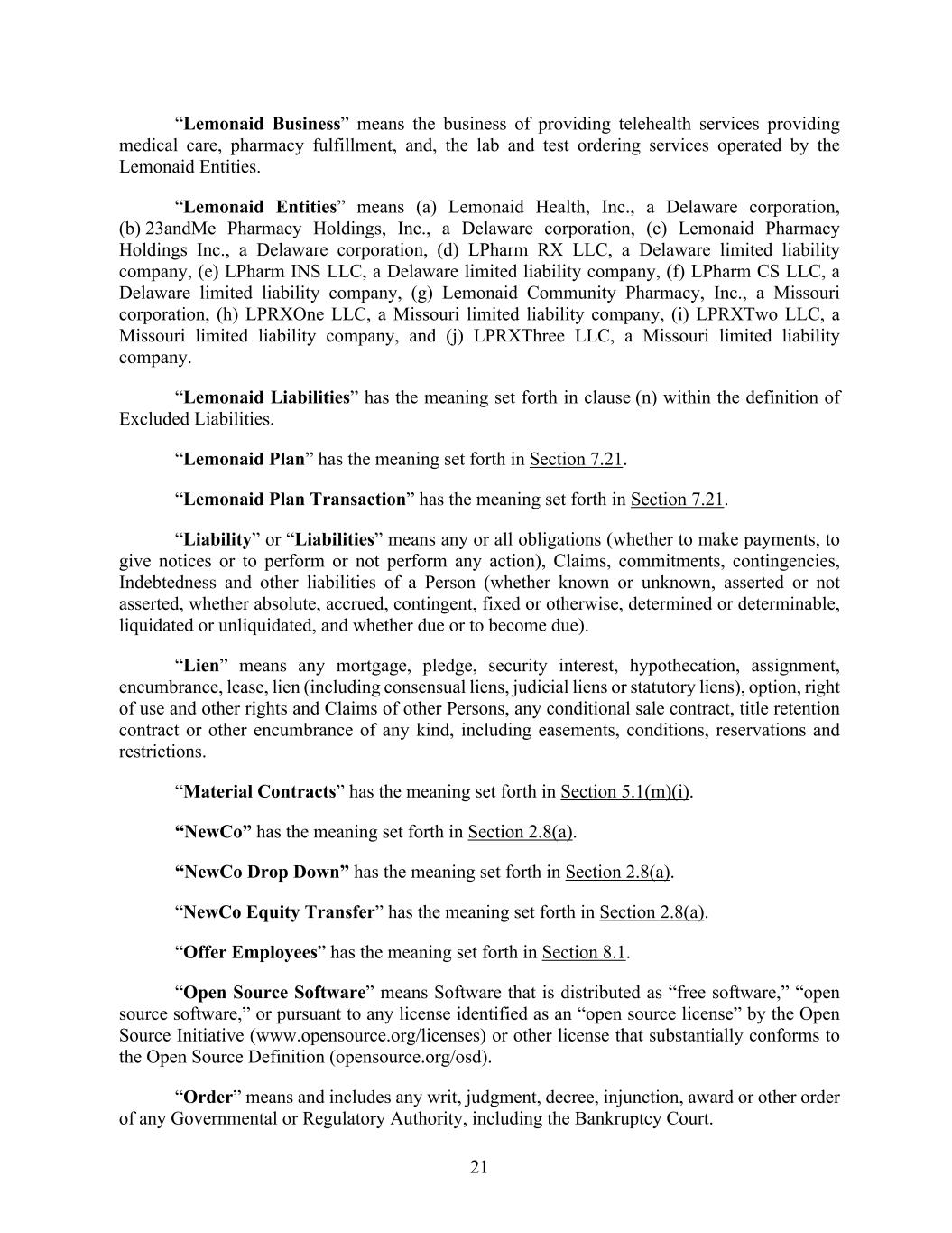 21 “Lemonaid Business” means the business of providing telehealth services providing medical care, pharmacy fulfillment, and, the lab and test ordering services operated by the Lemonaid Entities. “Lemonaid Entities” means (a) Lemonaid Health, Inc., a Delaware corporation, (b) 23andMe Pharmacy Holdings, Inc., a Delaware corporation, (c) Lemonaid Pharmacy Holdings Inc., a Delaware corporation, (d) LPharm RX LLC, a Delaware limited liability company, (e) LPharm INS LLC, a Delaware limited liability company, (f) LPharm CS LLC, a Delaware limited liability company, (g) Lemonaid Community Pharmacy, Inc., a Missouri corporation, (h) LPRXOne LLC, a Missouri limited liability company, (i) LPRXTwo LLC, a Missouri limited liability company, and (j) LPRXThree LLC, a Missouri limited liability company. “Lemonaid Liabilities” has the meaning set forth in clause (n) within the definition of Excluded Liabilities. “Lemonaid Plan” has the meaning set forth in Section 7.21. “Lemonaid Plan Transaction” has the meaning set forth in Section 7.21. “Liability” or “Liabilities” means any or all obligations (whether to make payments, to give notices or to perform or not perform any action), Claims, commitments, contingencies, Indebtedness and other liabilities of a Person (whether known or unknown, asserted or not asserted, whether absolute, accrued, contingent, fixed or otherwise, determined or determinable, liquidated or unliquidated, and whether due or to become due). “Lien” means any mortgage, pledge, security interest, hypothecation, assignment, encumbrance, lease, lien (including consensual liens, judicial liens or statutory liens), option, right of use and other rights and Claims of other Persons, any conditional sale contract, title retention contract or other encumbrance of any kind, including easements, conditions, reservations and restrictions. “Material Contracts” has the meaning set forth in Section 5.1(m)(i). “NewCo” has the meaning set forth in Section 2.8(a). “NewCo Drop Down” has the meaning set forth in Section 2.8(a). “NewCo Equity Transfer” has the meaning set forth in Section 2.8(a). “Offer Employees” has the meaning set forth in Section 8.1. “Open Source Software” means Software that is distributed as “free software,” “open source software,” or pursuant to any license identified as an “open source license” by the Open Source Initiative (www.opensource.org/licenses) or other license that substantially conforms to the Open Source Definition (opensource.org/osd). “Order” means and includes any writ, judgment, decree, injunction, award or other order of any Governmental or Regulatory Authority, including the Bankruptcy Court.