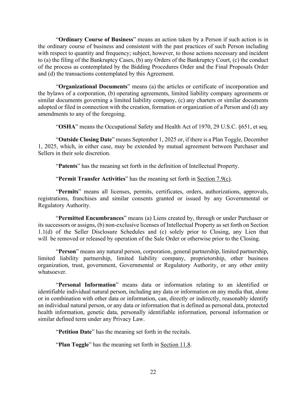 22 “Ordinary Course of Business” means an action taken by a Person if such action is in the ordinary course of business and consistent with the past practices of such Person including with respect to quantity and frequency; subject, however, to those actions necessary and incident to (a) the filing of the Bankruptcy Cases, (b) any Orders of the Bankruptcy Court, (c) the conduct of the process as contemplated by the Bidding Procedures Order and the Final Proposals Order and (d) the transactions contemplated by this Agreement. “Organizational Documents” means (a) the articles or certificate of incorporation and the bylaws of a corporation, (b) operating agreements, limited liability company agreements or similar documents governing a limited liability company, (c) any charters or similar documents adopted or filed in connection with the creation, formation or organization of a Person and (d) any amendments to any of the foregoing. “OSHA” means the Occupational Safety and Health Act of 1970, 29 U.S.C. §651, et seq. “Outside Closing Date” means September 1, 2025 or, if there is a Plan Toggle, December 1, 2025, which, in either case, may be extended by mutual agreement between Purchaser and Sellers in their sole discretion. “Patents” has the meaning set forth in the definition of Intellectual Property. “Permit Transfer Activities” has the meaning set forth in Section 7.9(c). “Permits” means all licenses, permits, certificates, orders, authorizations, approvals, registrations, franchises and similar consents granted or issued by any Governmental or Regulatory Authority. “Permitted Encumbrances” means (a) Liens created by, through or under Purchaser or its successors or assigns, (b) non-exclusive licenses of Intellectual Property as set forth on Section 1.1(d) of the Seller Disclosure Schedules and (c) solely prior to Closing, any Lien that will be removed or released by operation of the Sale Order or otherwise prior to the Closing. “Person” means any natural person, corporation, general partnership, limited partnership, limited liability partnership, limited liability company, proprietorship, other business organization, trust, government, Governmental or Regulatory Authority, or any other entity whatsoever. “Personal Information” means data or information relating to an identified or identifiable individual natural person, including any data or information on any media that, alone or in combination with other data or information, can, directly or indirectly, reasonably identify an individual natural person, or any data or information that is defined as personal data, protected health information, genetic data, personally identifiable information, personal information or similar defined term under any Privacy Law. “Petition Date” has the meaning set forth in the recitals. “Plan Toggle” has the meaning set forth in Section 11.8.