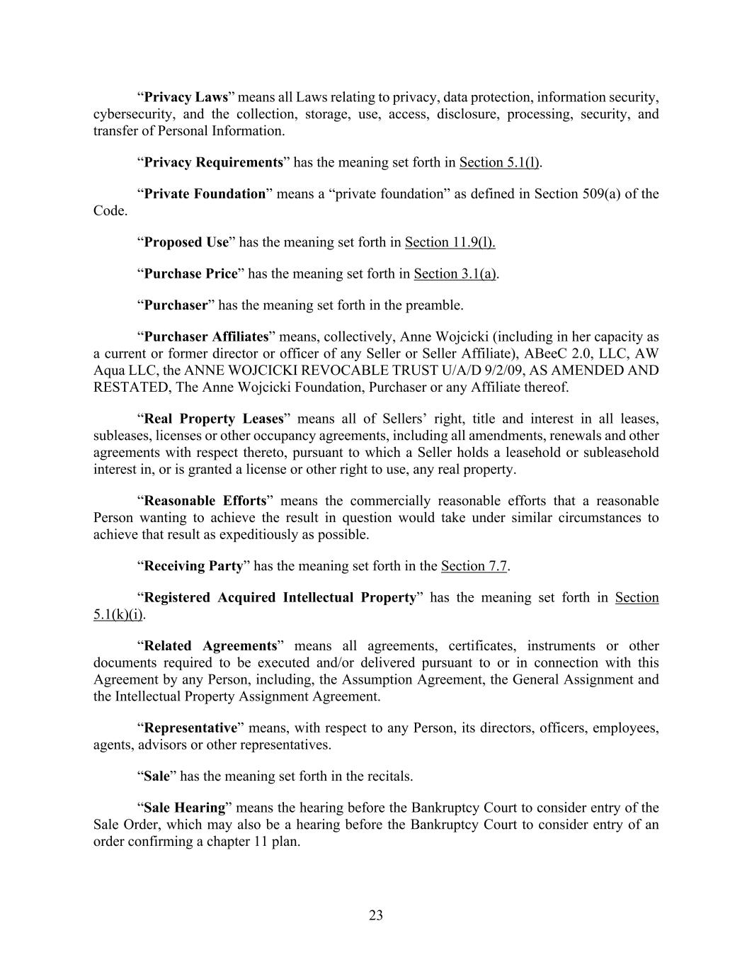 23 “Privacy Laws” means all Laws relating to privacy, data protection, information security, cybersecurity, and the collection, storage, use, access, disclosure, processing, security, and transfer of Personal Information. “Privacy Requirements” has the meaning set forth in Section 5.1(l). “Private Foundation” means a “private foundation” as defined in Section 509(a) of the Code. “Proposed Use” has the meaning set forth in Section 11.9(l). “Purchase Price” has the meaning set forth in Section 3.1(a). “Purchaser” has the meaning set forth in the preamble. “Purchaser Affiliates” means, collectively, Anne Wojcicki (including in her capacity as a current or former director or officer of any Seller or Seller Affiliate), ABeeC 2.0, LLC, AW Aqua LLC, the ANNE WOJCICKI REVOCABLE TRUST U/A/D 9/2/09, AS AMENDED AND RESTATED, The Anne Wojcicki Foundation, Purchaser or any Affiliate thereof. “Real Property Leases” means all of Sellers’ right, title and interest in all leases, subleases, licenses or other occupancy agreements, including all amendments, renewals and other agreements with respect thereto, pursuant to which a Seller holds a leasehold or subleasehold interest in, or is granted a license or other right to use, any real property. “Reasonable Efforts” means the commercially reasonable efforts that a reasonable Person wanting to achieve the result in question would take under similar circumstances to achieve that result as expeditiously as possible. “Receiving Party” has the meaning set forth in the Section 7.7. “Registered Acquired Intellectual Property” has the meaning set forth in Section 5.1(k)(i). “Related Agreements” means all agreements, certificates, instruments or other documents required to be executed and/or delivered pursuant to or in connection with this Agreement by any Person, including, the Assumption Agreement, the General Assignment and the Intellectual Property Assignment Agreement. “Representative” means, with respect to any Person, its directors, officers, employees, agents, advisors or other representatives. “Sale” has the meaning set forth in the recitals. “Sale Hearing” means the hearing before the Bankruptcy Court to consider entry of the Sale Order, which may also be a hearing before the Bankruptcy Court to consider entry of an order confirming a chapter 11 plan.