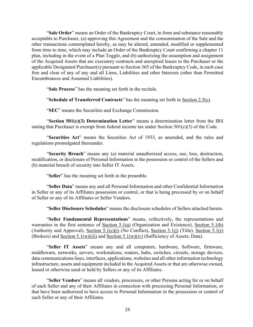 24 “Sale Order” means an Order of the Bankruptcy Court, in form and substance reasonably acceptable to Purchaser, (a) approving this Agreement and the consummation of the Sale and the other transactions contemplated hereby, as may be altered, amended, modified or supplemented from time to time, which may include an Order of the Bankruptcy Court confirming a chapter 11 plan, including in the event of a Plan Toggle, and (b) authorizing the assumption and assignment of the Acquired Assets that are executory contracts and unexpired leases to the Purchaser or the applicable Designated Purchaser(s) pursuant to Section 365 of the Bankruptcy Code, in each case free and clear of any of any and all Liens, Liabilities and other Interests (other than Permitted Encumbrances and Assumed Liabilities). “Sale Process” has the meaning set forth in the recitals. “Schedule of Transferred Contracts” has the meaning set forth in Section 2.5(c). “SEC” means the Securities and Exchange Commission. “Section 501(c)(3) Determination Letter” means a determination letter from the IRS stating that Purchaser is exempt from federal income tax under Section 501(c)(3) of the Code. “Securities Act” means the Securities Act of 1933, as amended, and the rules and regulations promulgated thereunder. “Security Breach” means any (a) material unauthorized access, use, loss, destruction, modification, or disclosure of Personal Information in the possession or control of the Sellers and (b) material breach of security into Seller IT Assets. “Seller” has the meaning set forth in the preamble. “Seller Data” means any and all Personal Information and other Confidential Information in Seller or any of its Affiliates possession or control, or that is being processed by or on behalf of Seller or any of its Affiliates or Seller Vendors. “Seller Disclosure Schedules” means the disclosure schedules of Sellers attached hereto. “Seller Fundamental Representations” means, collectively, the representations and warranties in the first sentence of Section 5.1(a) (Organization and Existence), Section 5.1(b) (Authority and Approval), Section 5.1(c)(i) (No Conflict), Section 5.1(j) (Title), Section 5.1(r) (Brokers) and Section 5.1(w)(iii) and Section 5.1(w)(iv) (Sufficiency of Assets; Data). “Seller IT Assets” means any and all computers, hardware, Software, firmware, middleware, networks, servers, workstations, routers, hubs, switches, circuits, storage devices, data communications lines, interfaces, applications, websites and all other information technology infrastructure, assets and equipment included in the Acquired Assets or that are otherwise owned, leased or otherwise used or held by Sellers or any of its Affiliates. “Seller Vendors” means all vendors, processors, or other Persons acting for or on behalf of each Seller and any of their Affiliates in connection with processing Personal Information, or that have been authorized to have access to Personal Information in the possession or control of each Seller or any of their Affiliates.