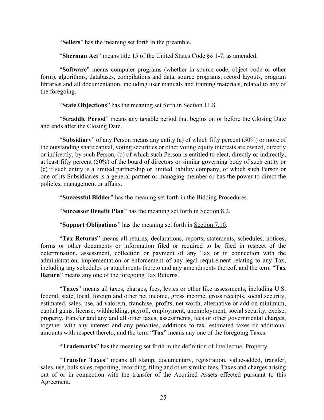 25 “Sellers” has the meaning set forth in the preamble. “Sherman Act” means title 15 of the United States Code §§ 1-7, as amended. “Software” means computer programs (whether in source code, object code or other form), algorithms, databases, compilations and data, source programs, record layouts, program libraries and all documentation, including user manuals and training materials, related to any of the foregoing. “State Objections” has the meaning set forth in Section 11.8. “Straddle Period” means any taxable period that begins on or before the Closing Date and ends after the Closing Date. “Subsidiary” of any Person means any entity (a) of which fifty percent (50%) or more of the outstanding share capital, voting securities or other voting equity interests are owned, directly or indirectly, by such Person, (b) of which such Person is entitled to elect, directly or indirectly, at least fifty percent (50%) of the board of directors or similar governing body of such entity or (c) if such entity is a limited partnership or limited liability company, of which such Person or one of its Subsidiaries is a general partner or managing member or has the power to direct the policies, management or affairs. “Successful Bidder” has the meaning set forth in the Bidding Procedures. “Successor Benefit Plan” has the meaning set forth in Section 8.2. “Support Obligations” has the meaning set forth in Section 7.10. “Tax Returns” means all returns, declarations, reports, statements, schedules, notices, forms or other documents or information filed or required to be filed in respect of the determination, assessment, collection or payment of any Tax or in connection with the administration, implementation or enforcement of any legal requirement relating to any Tax, including any schedules or attachments thereto and any amendments thereof, and the term “Tax Return” means any one of the foregoing Tax Returns. “Taxes” means all taxes, charges, fees, levies or other like assessments, including U.S. federal, state, local, foreign and other net income, gross income, gross receipts, social security, estimated, sales, use, ad valorem, franchise, profits, net worth, alternative or add-on minimum, capital gains, license, withholding, payroll, employment, unemployment, social security, excise, property, transfer and any and all other taxes, assessments, fees or other governmental charges, together with any interest and any penalties, additions to tax, estimated taxes or additional amounts with respect thereto, and the term “Tax” means any one of the foregoing Taxes. “Trademarks” has the meaning set forth in the definition of Intellectual Property. “Transfer Taxes” means all stamp, documentary, registration, value-added, transfer, sales, use, bulk sales, reporting, recording, filing and other similar fees, Taxes and charges arising out of or in connection with the transfer of the Acquired Assets effected pursuant to this Agreement.