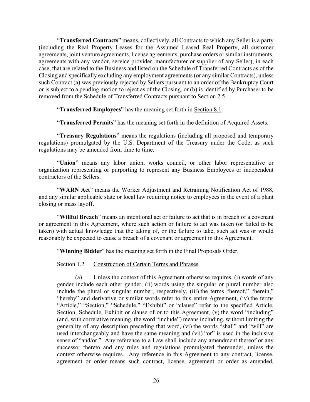 26 “Transferred Contracts” means, collectively, all Contracts to which any Seller is a party (including the Real Property Leases for the Assumed Leased Real Property, all customer agreements, joint venture agreements, license agreements, purchase orders or similar instruments, agreements with any vendor, service provider, manufacturer or supplier of any Seller), in each case, that are related to the Business and listed on the Schedule of Transferred Contracts as of the Closing and specifically excluding any employment agreements (or any similar Contracts), unless such Contract (a) was previously rejected by Sellers pursuant to an order of the Bankruptcy Court or is subject to a pending motion to reject as of the Closing, or (b) is identified by Purchaser to be removed from the Schedule of Transferred Contracts pursuant to Section 2.5. “Transferred Employees” has the meaning set forth in Section 8.1. “Transferred Permits” has the meaning set forth in the definition of Acquired Assets. “Treasury Regulations” means the regulations (including all proposed and temporary regulations) promulgated by the U.S. Department of the Treasury under the Code, as such regulations may be amended from time to time. “Union” means any labor union, works council, or other labor representative or organization representing or purporting to represent any Business Employees or independent contractors of the Sellers. “WARN Act” means the Worker Adjustment and Retraining Notification Act of 1988, and any similar applicable state or local law requiring notice to employees in the event of a plant closing or mass layoff. “Willful Breach” means an intentional act or failure to act that is in breach of a covenant or agreement in this Agreement, where such action or failure to act was taken (or failed to be taken) with actual knowledge that the taking of, or the failure to take, such act was or would reasonably be expected to cause a breach of a covenant or agreement in this Agreement. “Winning Bidder” has the meaning set forth in the Final Proposals Order. Section 1.2 Construction of Certain Terms and Phrases. (a) Unless the context of this Agreement otherwise requires, (i) words of any gender include each other gender, (ii) words using the singular or plural number also include the plural or singular number, respectively, (iii) the terms “hereof,” “herein,” “hereby” and derivative or similar words refer to this entire Agreement, (iv) the terms “Article,” “Section,” “Schedule,” “Exhibit” or “clause” refer to the specified Article, Section, Schedule, Exhibit or clause of or to this Agreement, (v) the word “including” (and, with correlative meaning, the word “include”) means including, without limiting the generality of any description preceding that word, (vi) the words “shall” and “will” are used interchangeably and have the same meaning and (vii) “or” is used in the inclusive sense of “and/or.” Any reference to a Law shall include any amendment thereof or any successor thereto and any rules and regulations promulgated thereunder, unless the context otherwise requires. Any reference in this Agreement to any contract, license, agreement or order means such contract, license, agreement or order as amended,