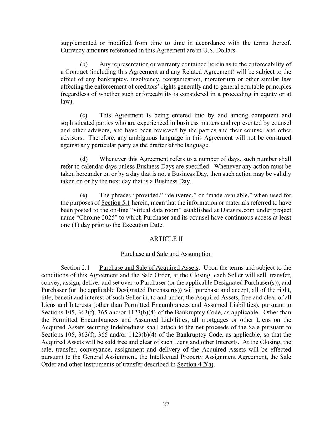 27 supplemented or modified from time to time in accordance with the terms thereof. Currency amounts referenced in this Agreement are in U.S. Dollars. (b) Any representation or warranty contained herein as to the enforceability of a Contract (including this Agreement and any Related Agreement) will be subject to the effect of any bankruptcy, insolvency, reorganization, moratorium or other similar law affecting the enforcement of creditors’ rights generally and to general equitable principles (regardless of whether such enforceability is considered in a proceeding in equity or at law). (c) This Agreement is being entered into by and among competent and sophisticated parties who are experienced in business matters and represented by counsel and other advisors, and have been reviewed by the parties and their counsel and other advisors. Therefore, any ambiguous language in this Agreement will not be construed against any particular party as the drafter of the language. (d) Whenever this Agreement refers to a number of days, such number shall refer to calendar days unless Business Days are specified. Whenever any action must be taken hereunder on or by a day that is not a Business Day, then such action may be validly taken on or by the next day that is a Business Day. (e) The phrases “provided,” “delivered,” or “made available,” when used for the purposes of Section 5.1 herein, mean that the information or materials referred to have been posted to the on-line “virtual data room” established at Datasite.com under project name “Chrome 2025” to which Purchaser and its counsel have continuous access at least one (1) day prior to the Execution Date. ARTICLE II Purchase and Sale and Assumption Section 2.1 Purchase and Sale of Acquired Assets. Upon the terms and subject to the conditions of this Agreement and the Sale Order, at the Closing, each Seller will sell, transfer, convey, assign, deliver and set over to Purchaser (or the applicable Designated Purchaser(s)), and Purchaser (or the applicable Designated Purchaser(s)) will purchase and accept, all of the right, title, benefit and interest of such Seller in, to and under, the Acquired Assets, free and clear of all Liens and Interests (other than Permitted Encumbrances and Assumed Liabilities), pursuant to Sections 105, 363(f), 365 and/or 1123(b)(4) of the Bankruptcy Code, as applicable. Other than the Permitted Encumbrances and Assumed Liabilities, all mortgages or other Liens on the Acquired Assets securing Indebtedness shall attach to the net proceeds of the Sale pursuant to Sections 105, 363(f), 365 and/or 1123(b)(4) of the Bankruptcy Code, as applicable, so that the Acquired Assets will be sold free and clear of such Liens and other Interests. At the Closing, the sale, transfer, conveyance, assignment and delivery of the Acquired Assets will be effected pursuant to the General Assignment, the Intellectual Property Assignment Agreement, the Sale Order and other instruments of transfer described in Section 4.2(a).